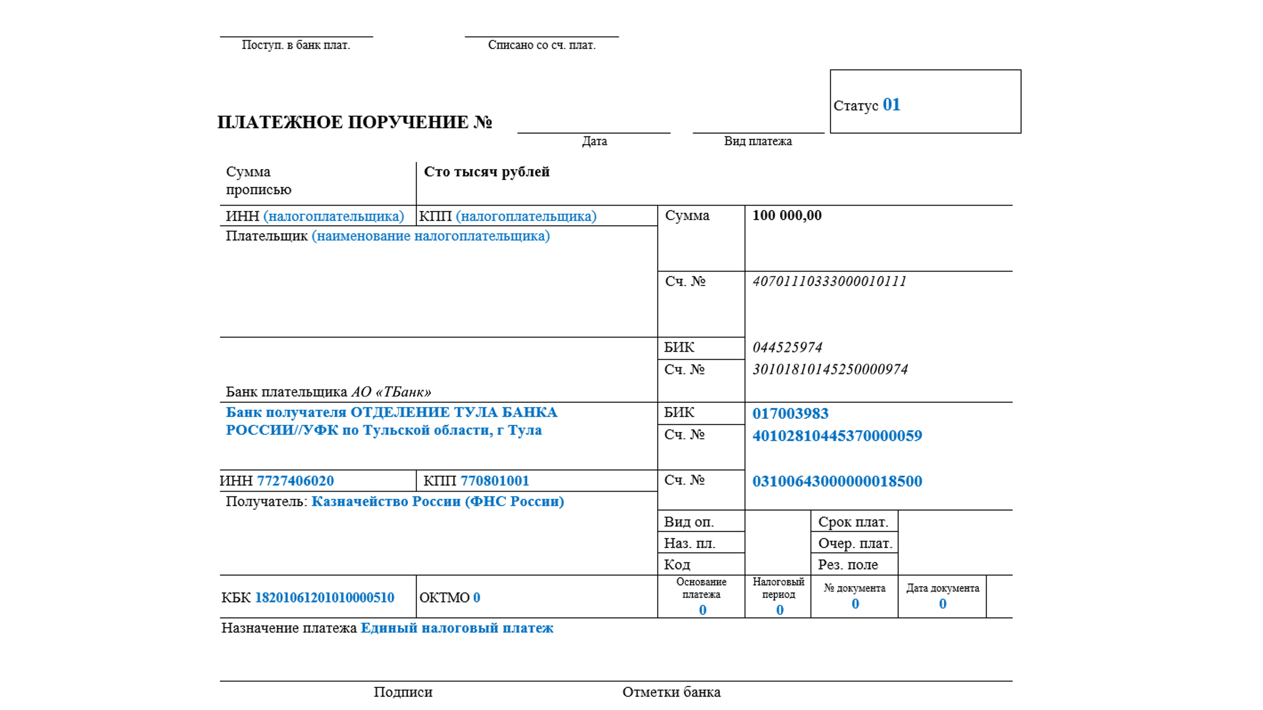 При перечислении налогов поручение удобно оформлять на сайте ФНС или в его приложениях. Плательщик вводит свои реквизиты, указывает вид налога, период уплаты, свое отделение налоговой инспекции. Данные получателя заполнятся автоматически.