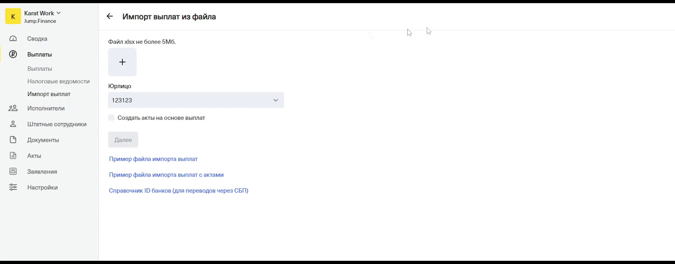 - Скачайте шаблон файла "Пример импорта выплат с актами”