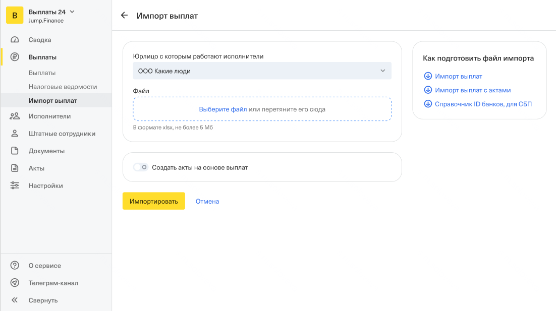 Файл для импорта остаётся таким же, как и для обычных выплат с актами.