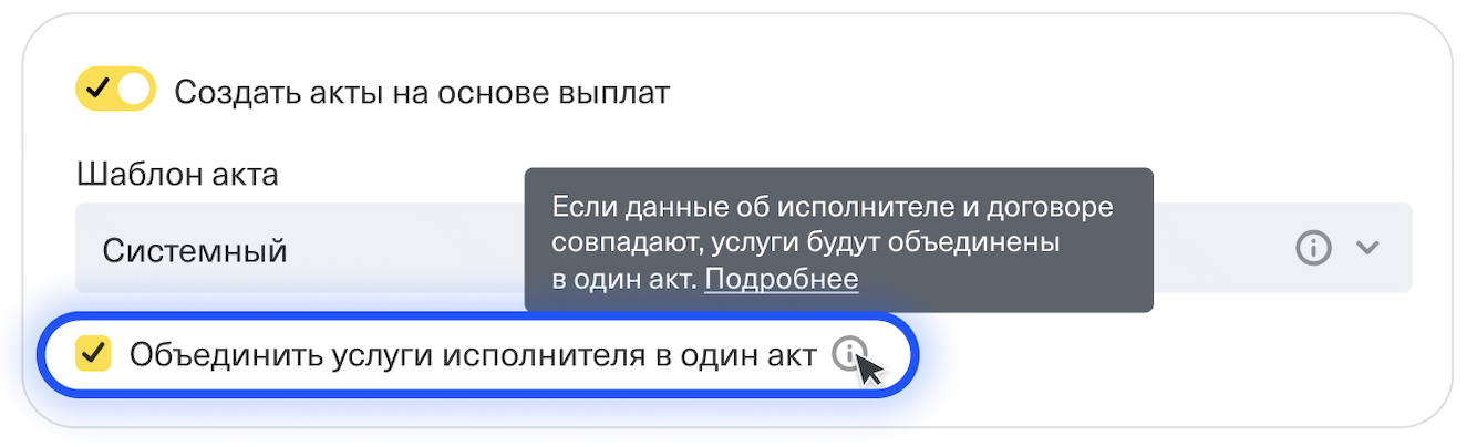 - Исполнителю будет достаточно подписать один акт для получения выплат
