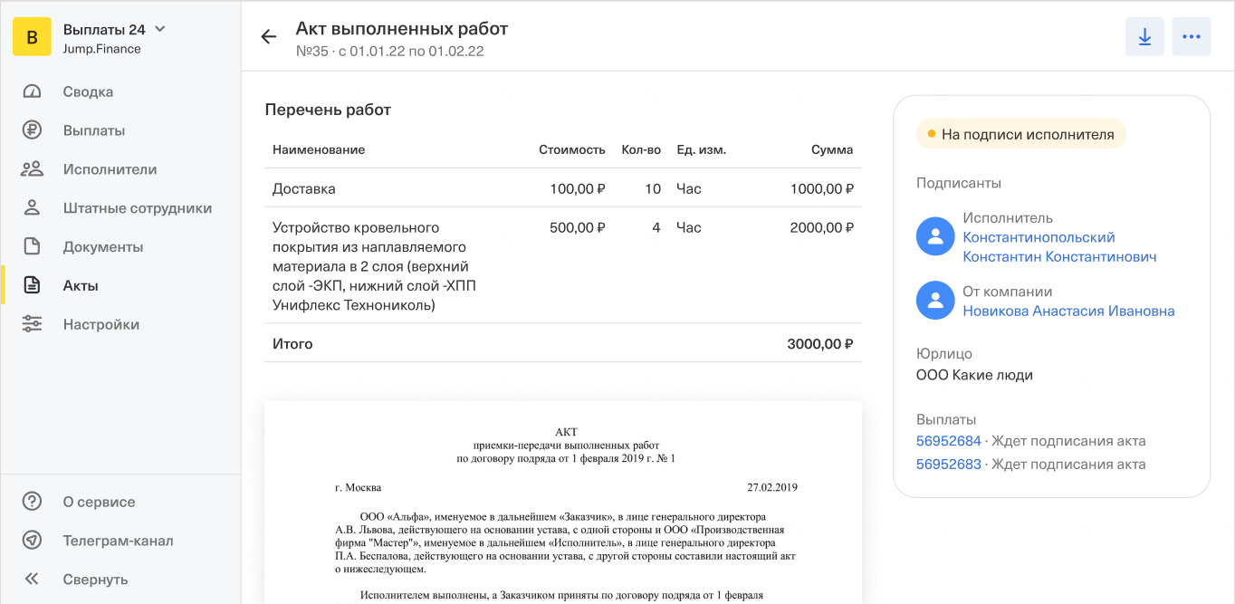 Готово! По каждой услуге из акта будет сформирована отдельная выплата, привязанная к нему.