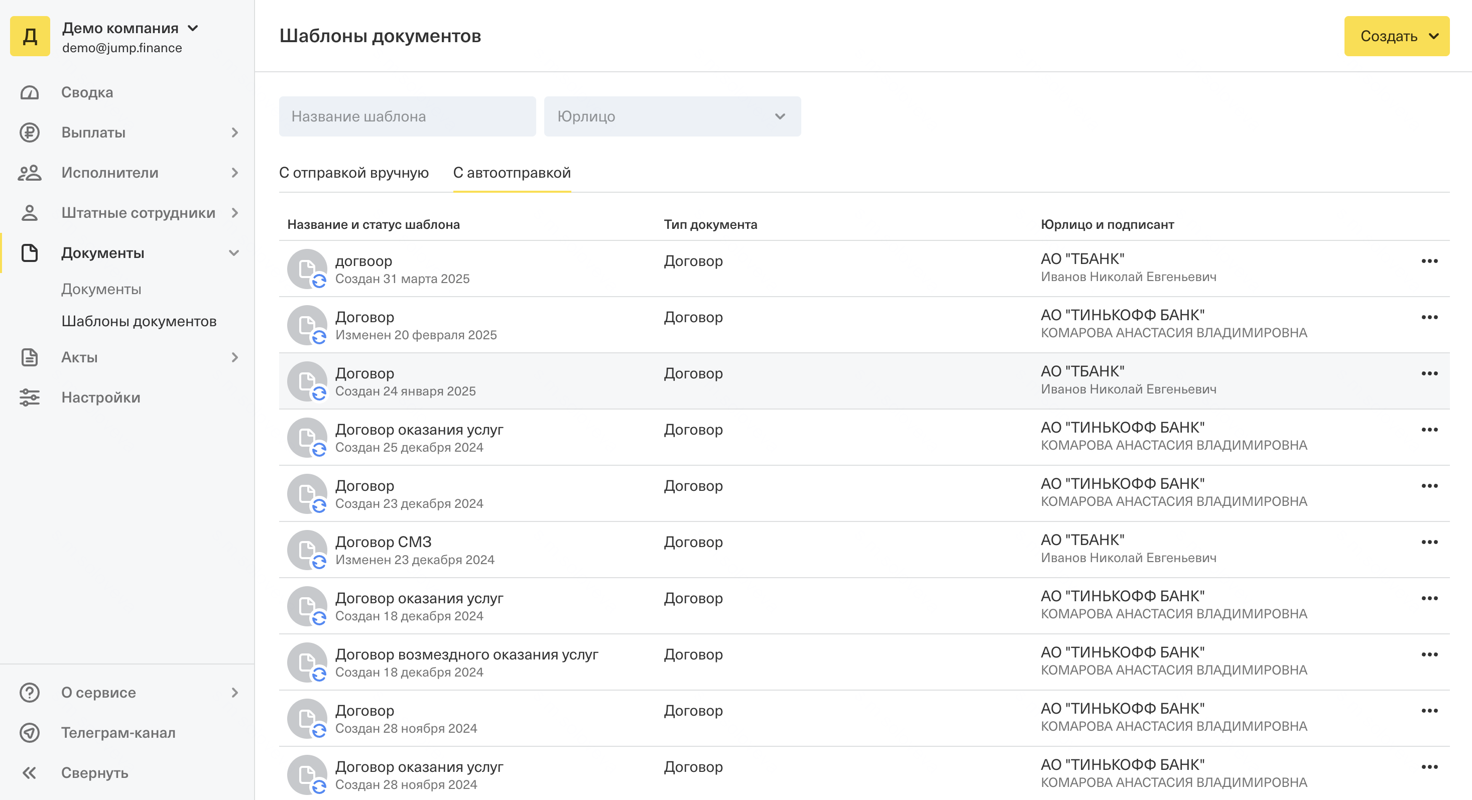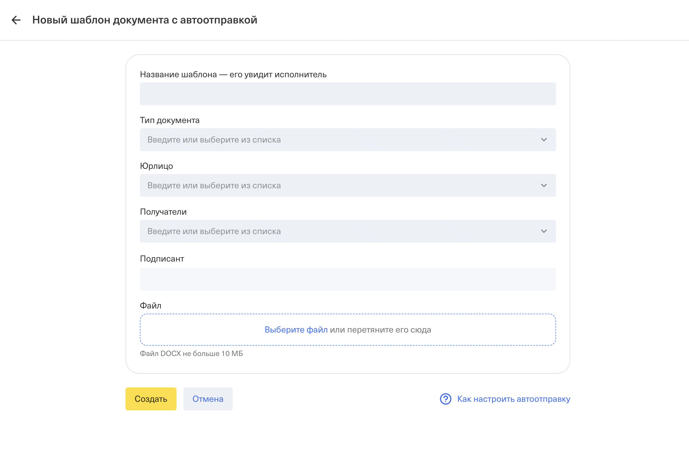 1) В разделе Шаблоны документов нажмите "Создать" и выберите вариант "С автоотправкой"