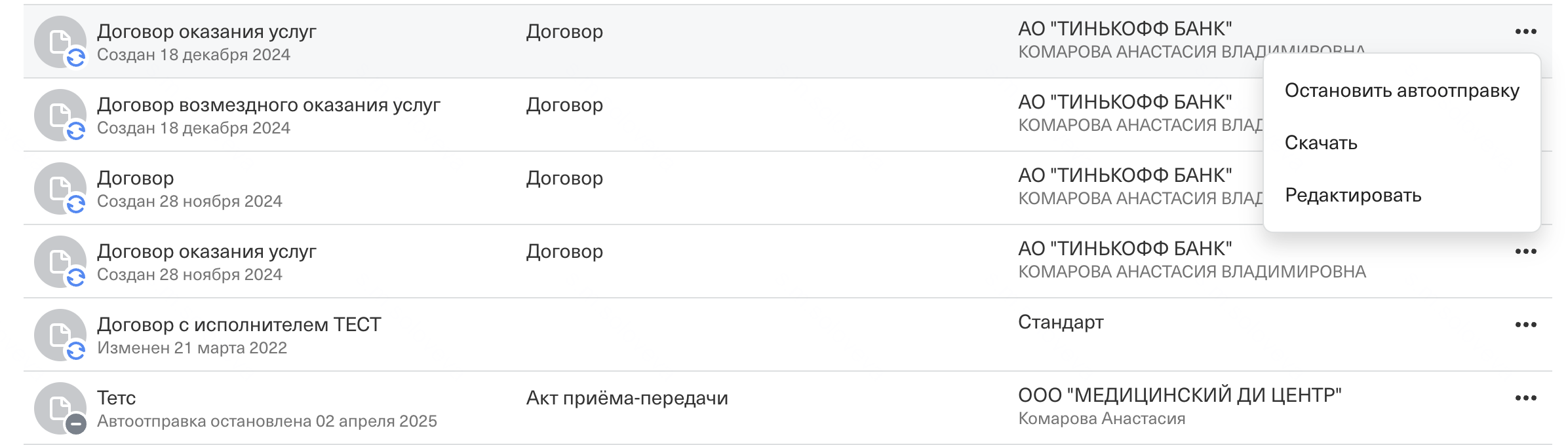 Если хотите перестать отправлять документ нажмите на три точки справа на выбранном шаблоне документа и выберите "Остановить отправку на всех". Документы, которые уже были отправлены исполнителям, сохранятся в личном кабинете.