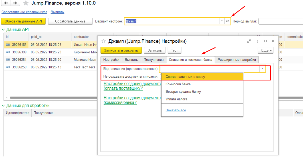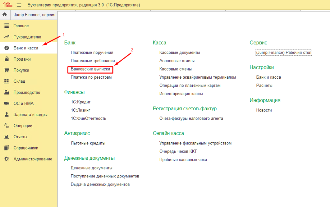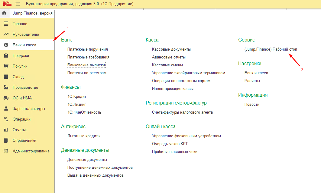 3. Чтобы установить нужный “Вид списания при сопоставлении” требуется перейти в настройки модуля в раздел “Банк и касса” - “Сервис” - “Jump.Finance Рабочий стол”
