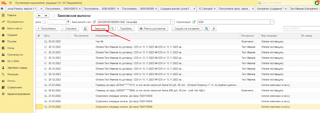 1. Для обработки банковской выписки сначала требуется ее загрузить, для этого необходимо перейти в раздел “Банк и касса” - “Банковские выписки” и нажать кнопку “Загрузить”
