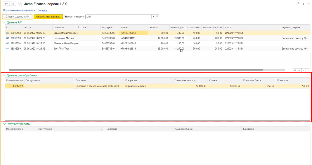 6. После этого система сопоставит данные из банковской выписки с выплатами, которые есть в ЛК и те выплаты, по которым найдено сопоставление выведет в раздел “Данные для обработки”