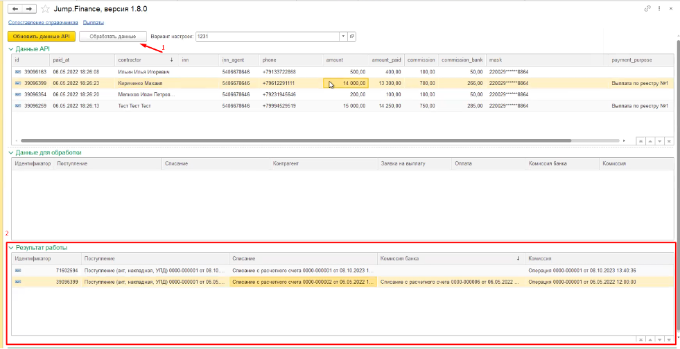 7. После этого требуется нажать кнопку “Обработать данные” и в поле “Результат работы” вы увидите сформированные документы по выписке.