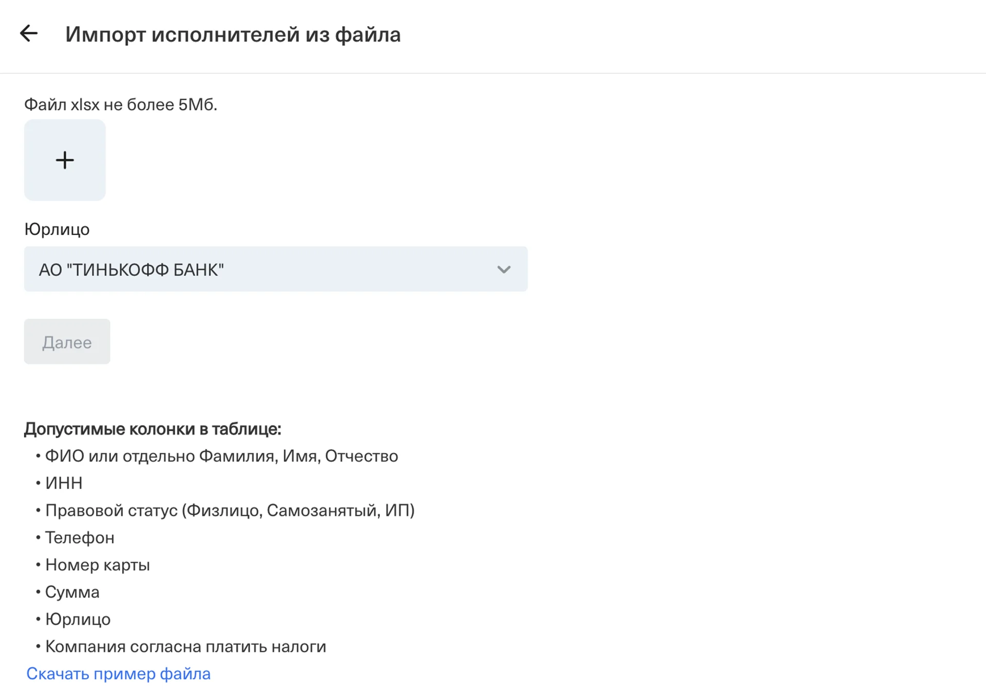 Для начисления средств, зайдите в раздел Исполнители – Импорт исполнителей - Добавить. Внизу страницы скачайте шаблон файла импорта и заполните его по образцу.