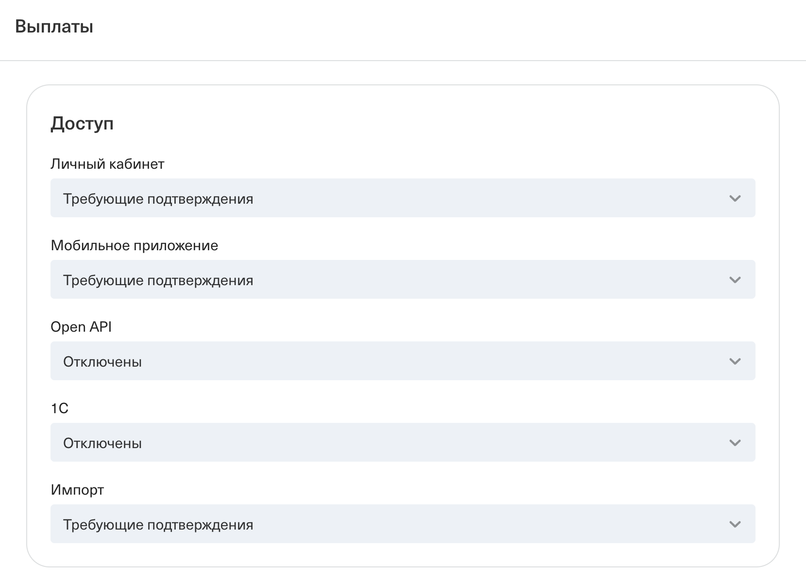 - Требующие подтверждения — выплата сначала попадёт на подтверждение пользователю, у которого есть права для подтверждения выплат. Выплата уйдёт в обработку, только когда пользователь её подтвердит;