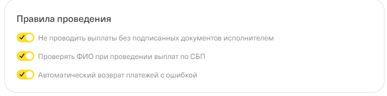 - Проверять ФИО при проведении выплат по СБП — при установке данного правила, при отправке выплат через систему быстрых платежей (по номеру телефона), система будет сверять ФИО исполнителя с ФИО держателя карты по указанному номеру телефона. Если данные не будут совпадать, выплата попадет в ошибку.