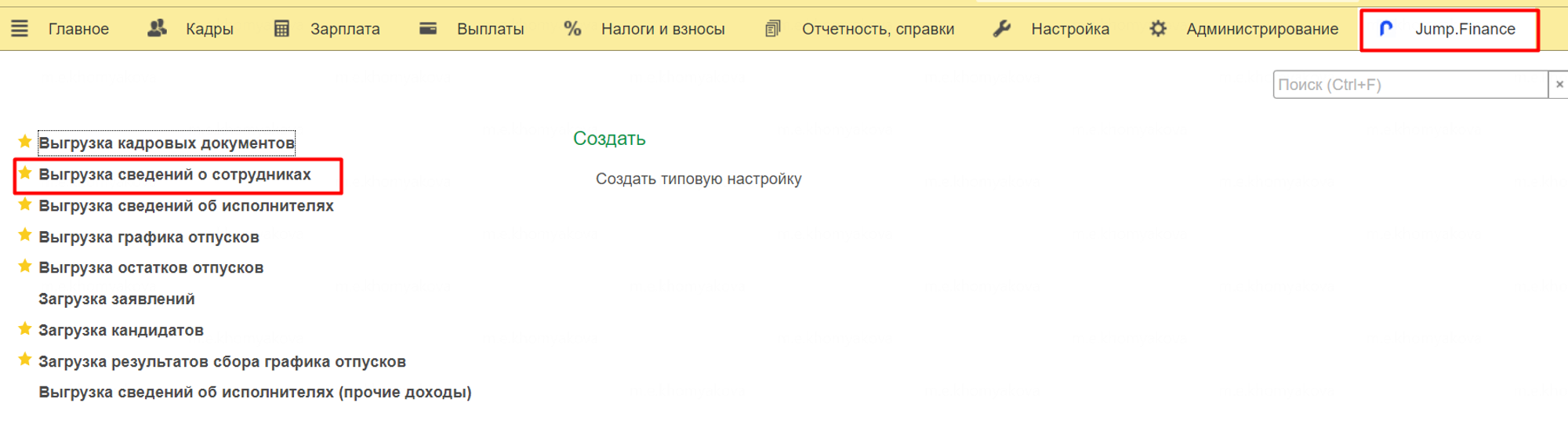 Далее перейти в раздел "Jump.Finance", подраздел "Выгрузка сведений о сотрудниках".