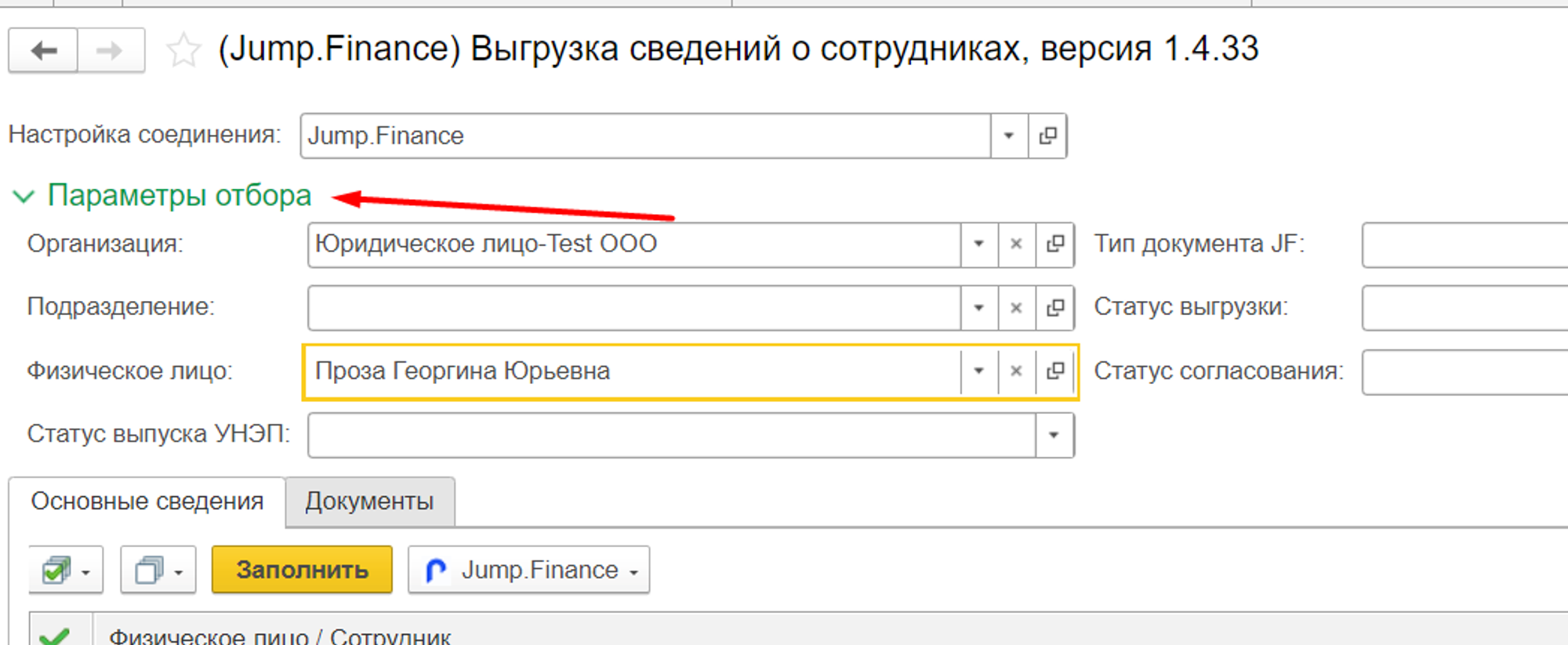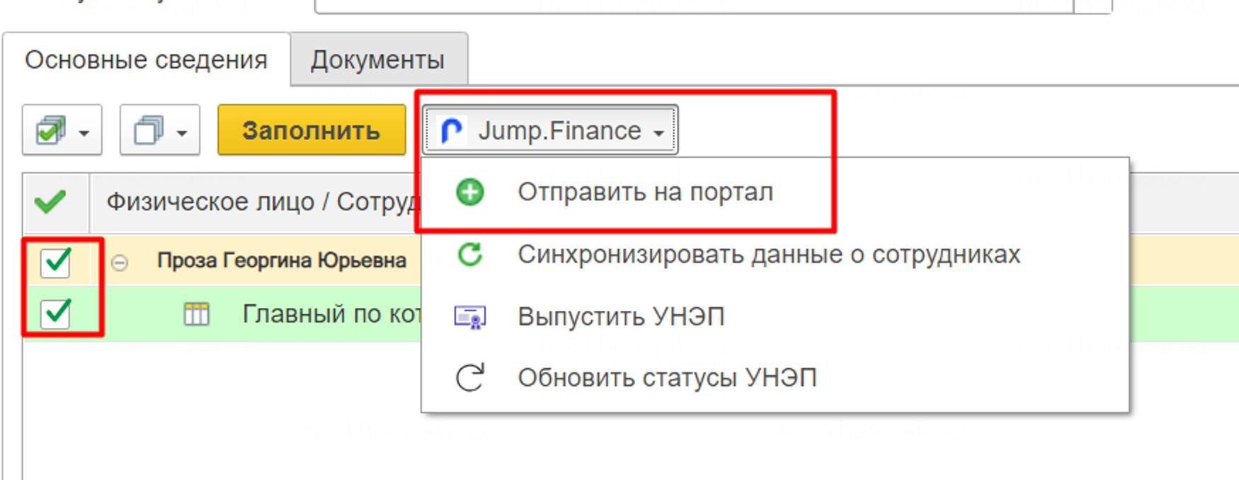 Далее нажмите "Заполнить" и отмечаете галочкой сотрудника и его должность, следом на кнопку "Jump.Finance".