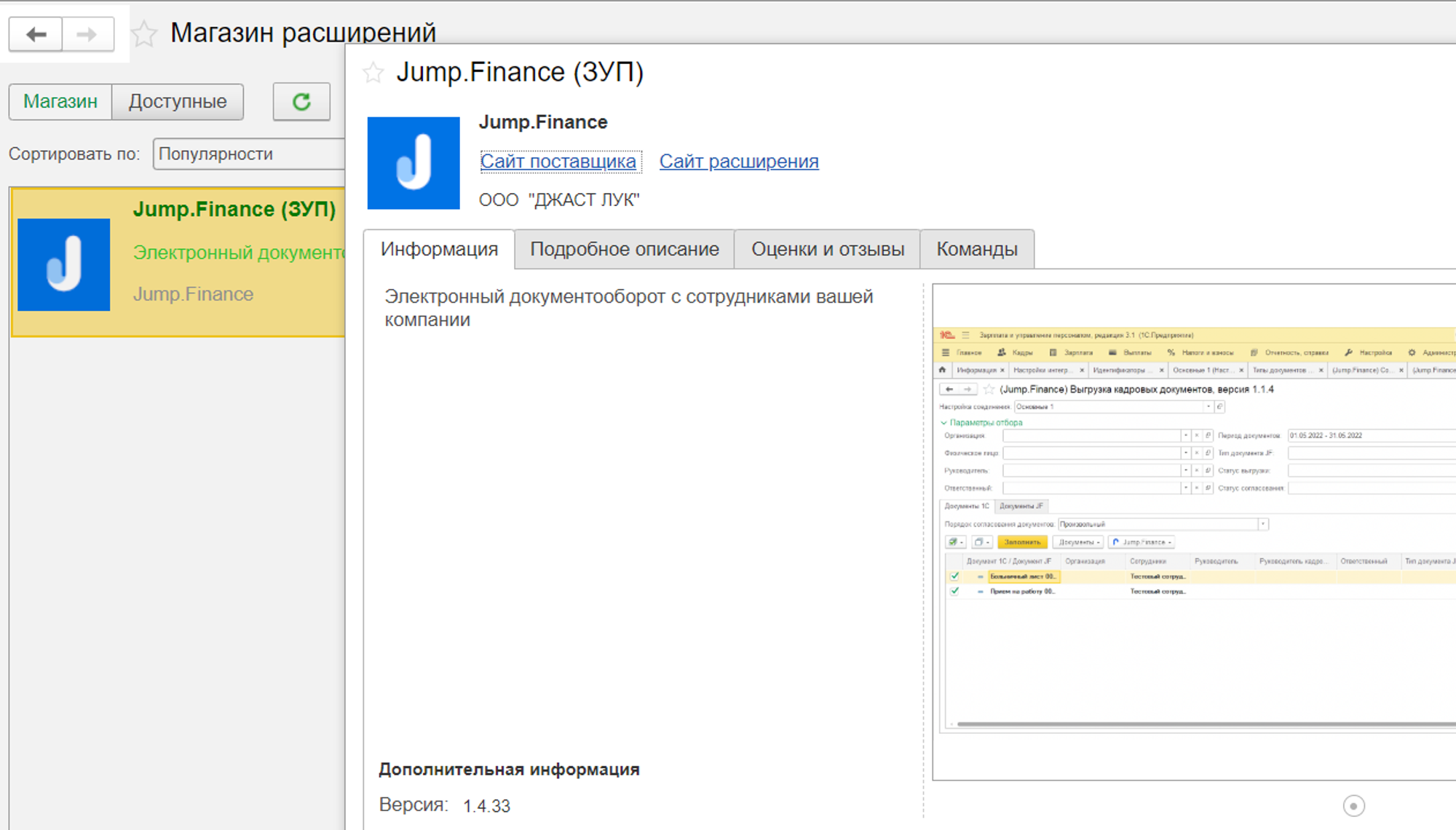 В поиске магазина введите Jump.Finance и нажмите “Установить”. Установка модуля в среднем занимает от 2 до 10 минут в зависимости от вашей базы данных1С.