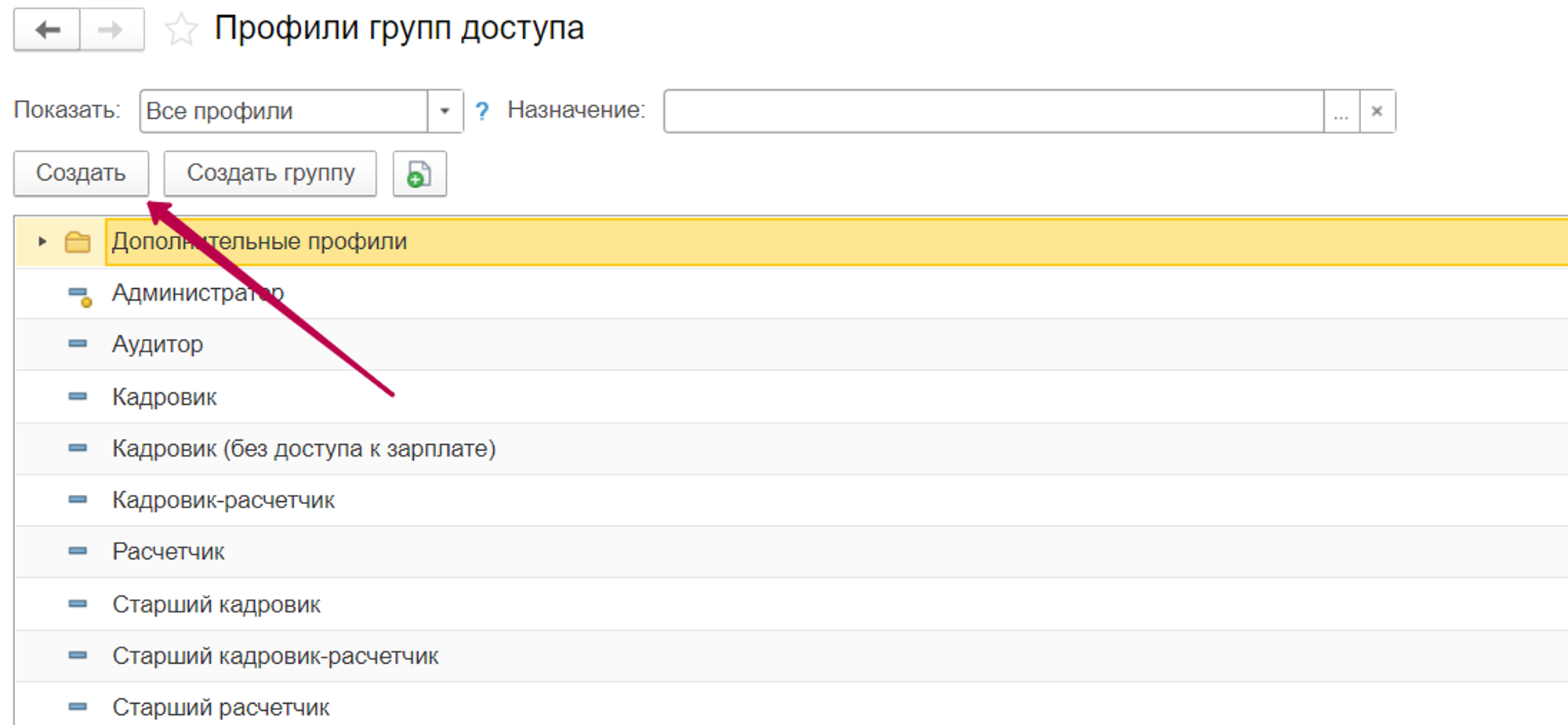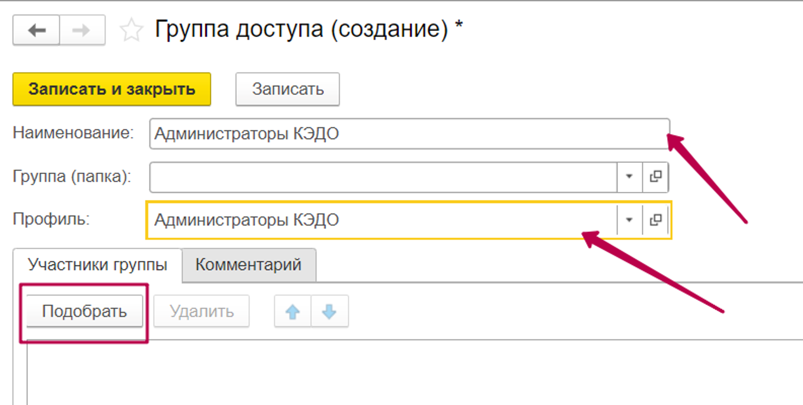 В графе “Наименование” пропишите название группы и в строке “Профиль” выберете роль “Администраторы КЭДО”, и нажимаете “Подобрать”