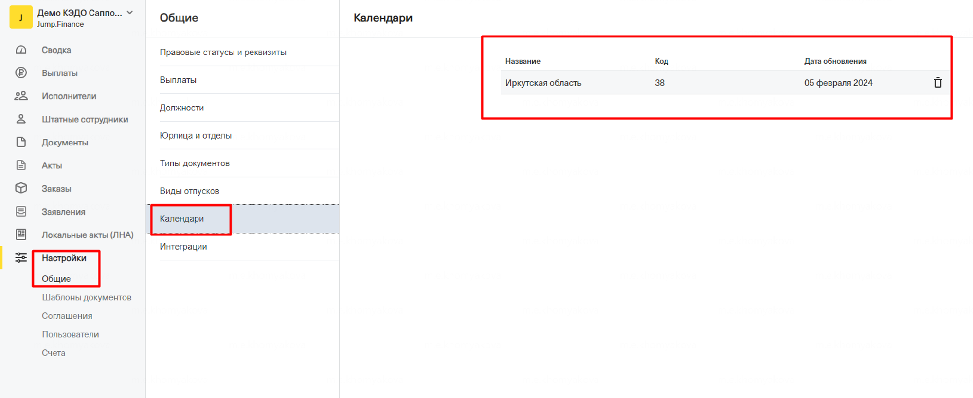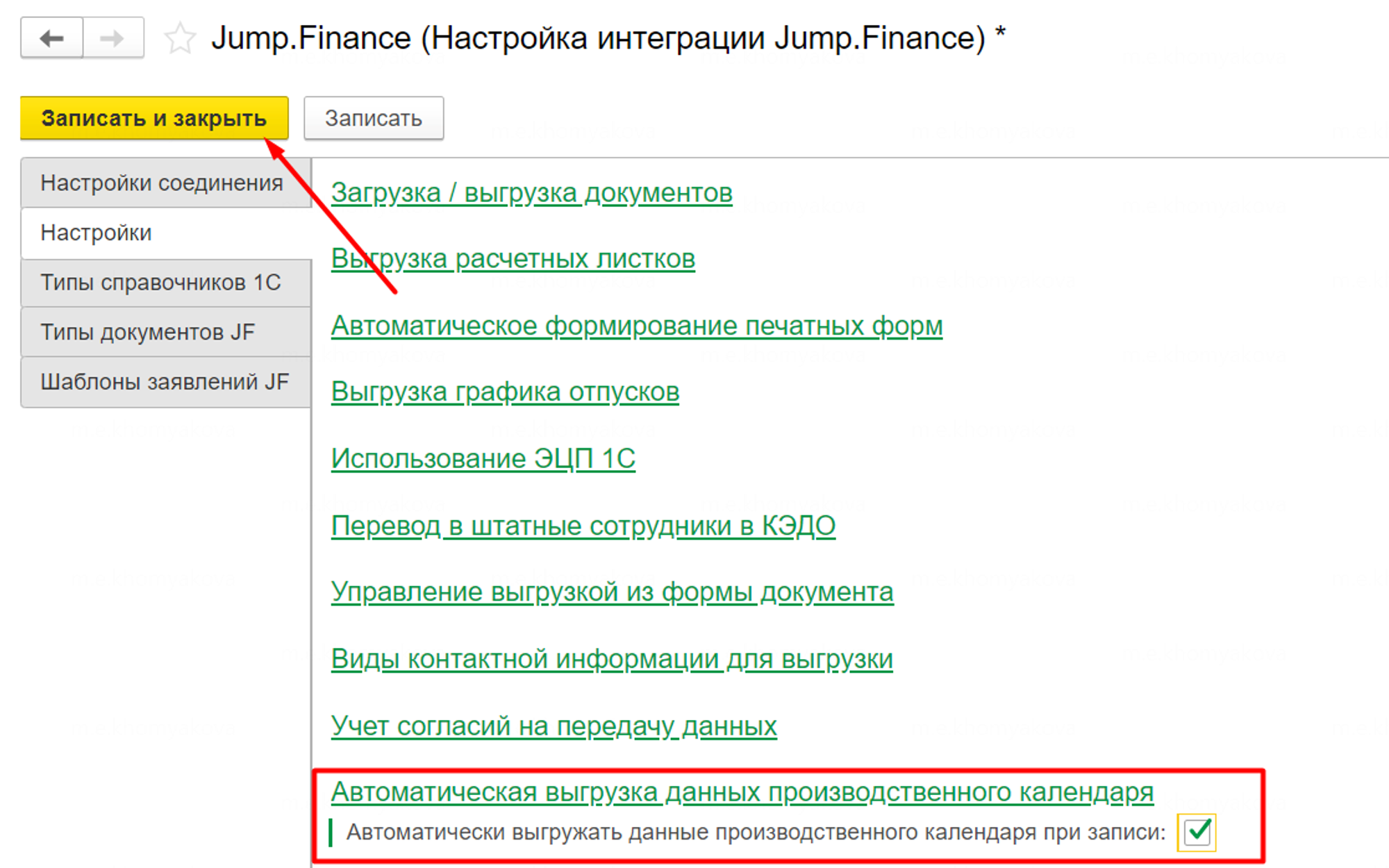 Чтобы информация из производственного календаря выгружалась автоматически, перейдите в “Настройки интеграции Jump Finance”, откройте настройки, поставьте галку “Автоматическая выгрузка данных производственного календаря” и запишите изменения.