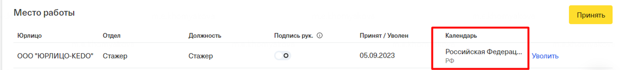 После выгрузки сотрудника в ЛК, в профиле сотрудника будет указан его календарь