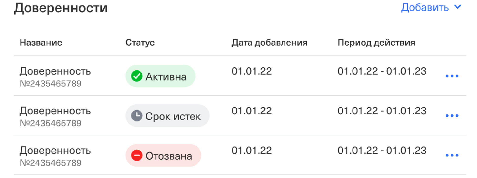 - “Не активна” - появляется в случае, если пользователь, выдавший (добавивший) доверенность переводит статус ВРУЧНУЮ, либо если из реестра ФНС пришла информация, что доверенность больше не действительна.