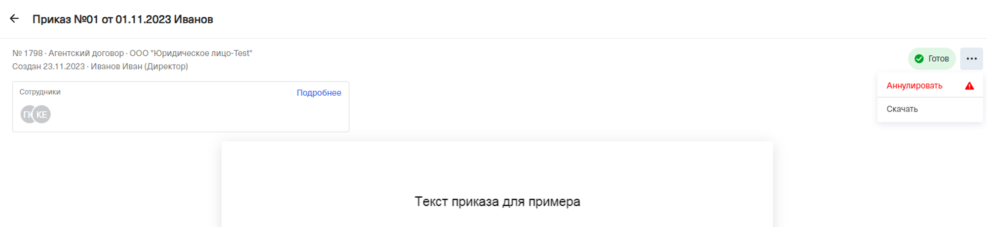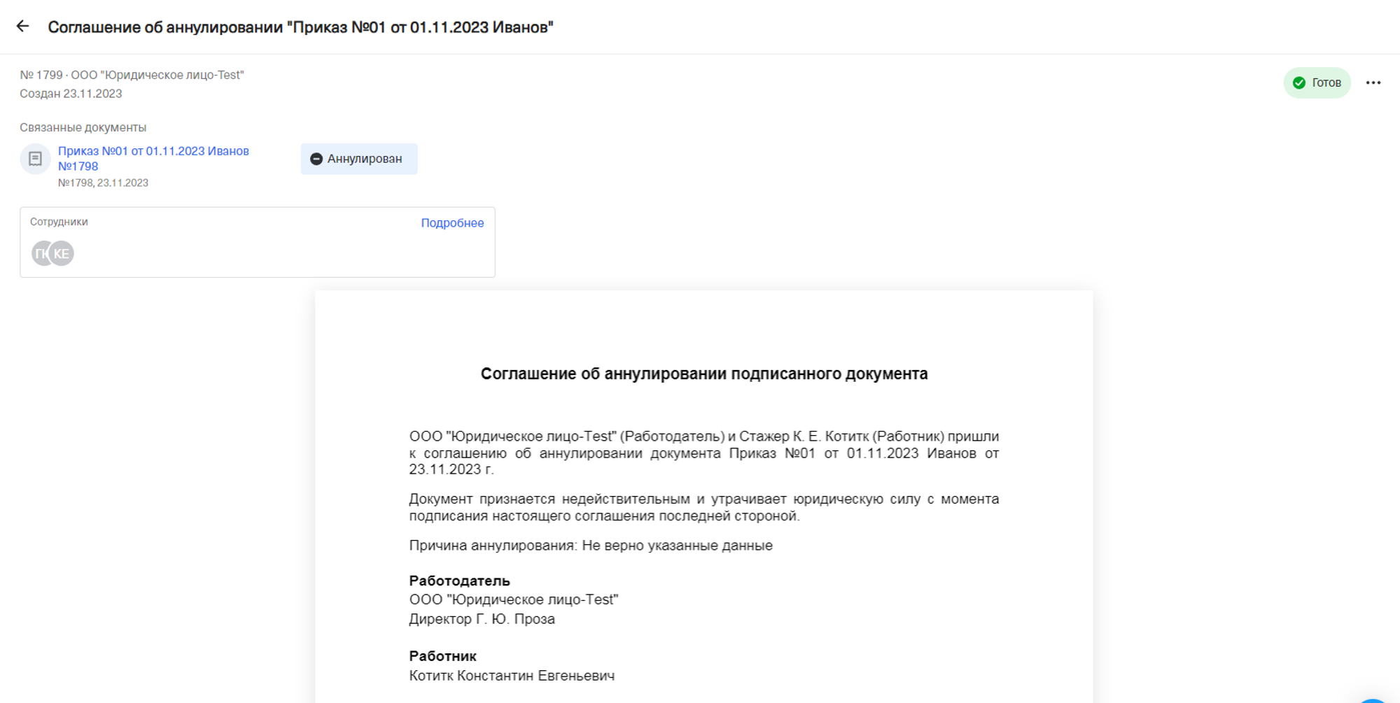 Подписанный документ, штатным сотрудником и кадровым специалистом (в роли него может выступать генеральный директор), можно аннулировать, если в нем обнаружена ошибка и для данного типа документа аннулирование было ранее разрешено в настройках ЛК.
