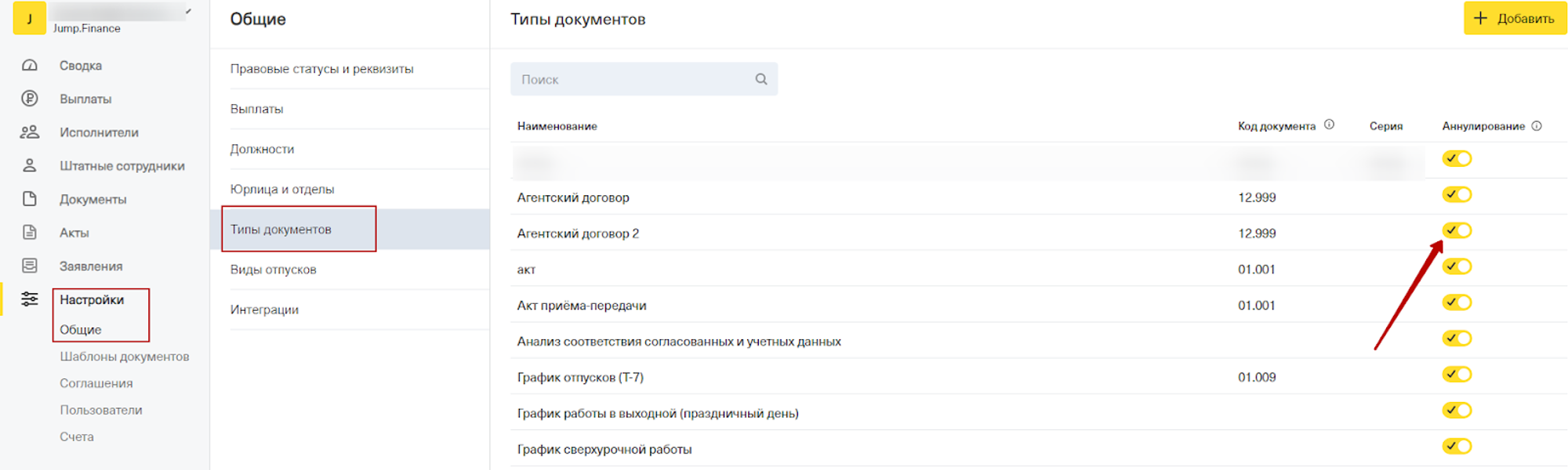 Для того чтобы была возможность аннулировать документ при настройке кабинета необходимо перейти в "Настройки-Общее-Типы документов" и установить на типе документа чек-бокс "Аннулирование".