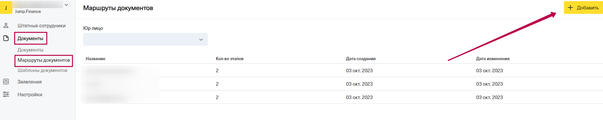 Чтобы создать маршрут, необходимо перейти во вкладку “Документы-Маршруты документов” и нажать “Добавить”