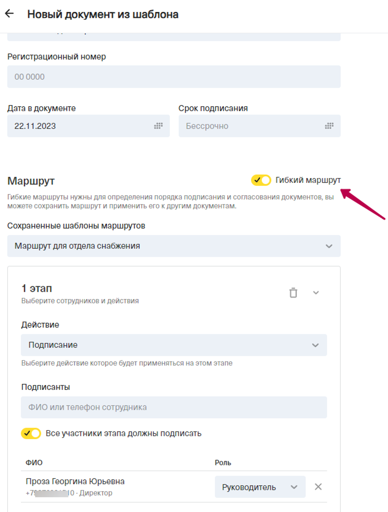Вы можете создать статичные маршруты документов в личном кабинете. Тогда при выборе маршрута документа вам не нужно будет менять сотрудников в маршруте, вы будете выбирать один стандартный маршрут для ваших документов.
