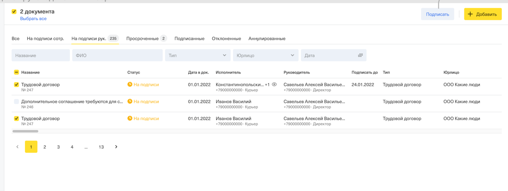 Во вкладке «На подписи руководителя» с помощью чек-боксов можно выбрать несколько документов и отправить на подпись. Если выбираются документы на разных страницах, выборка сохраняется и отправляется на подпись.