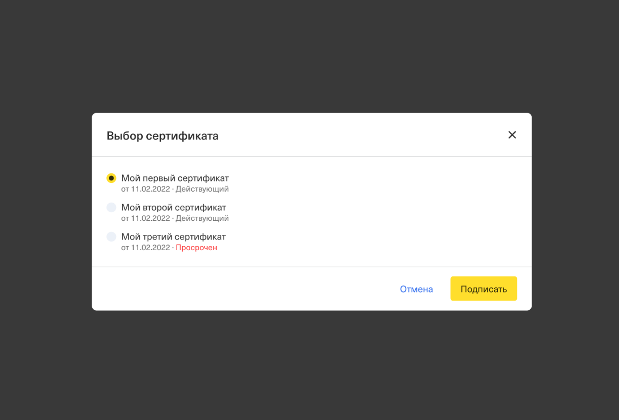 После нажатия кнопки “Подписать” появляется окно с выбором сертификата: