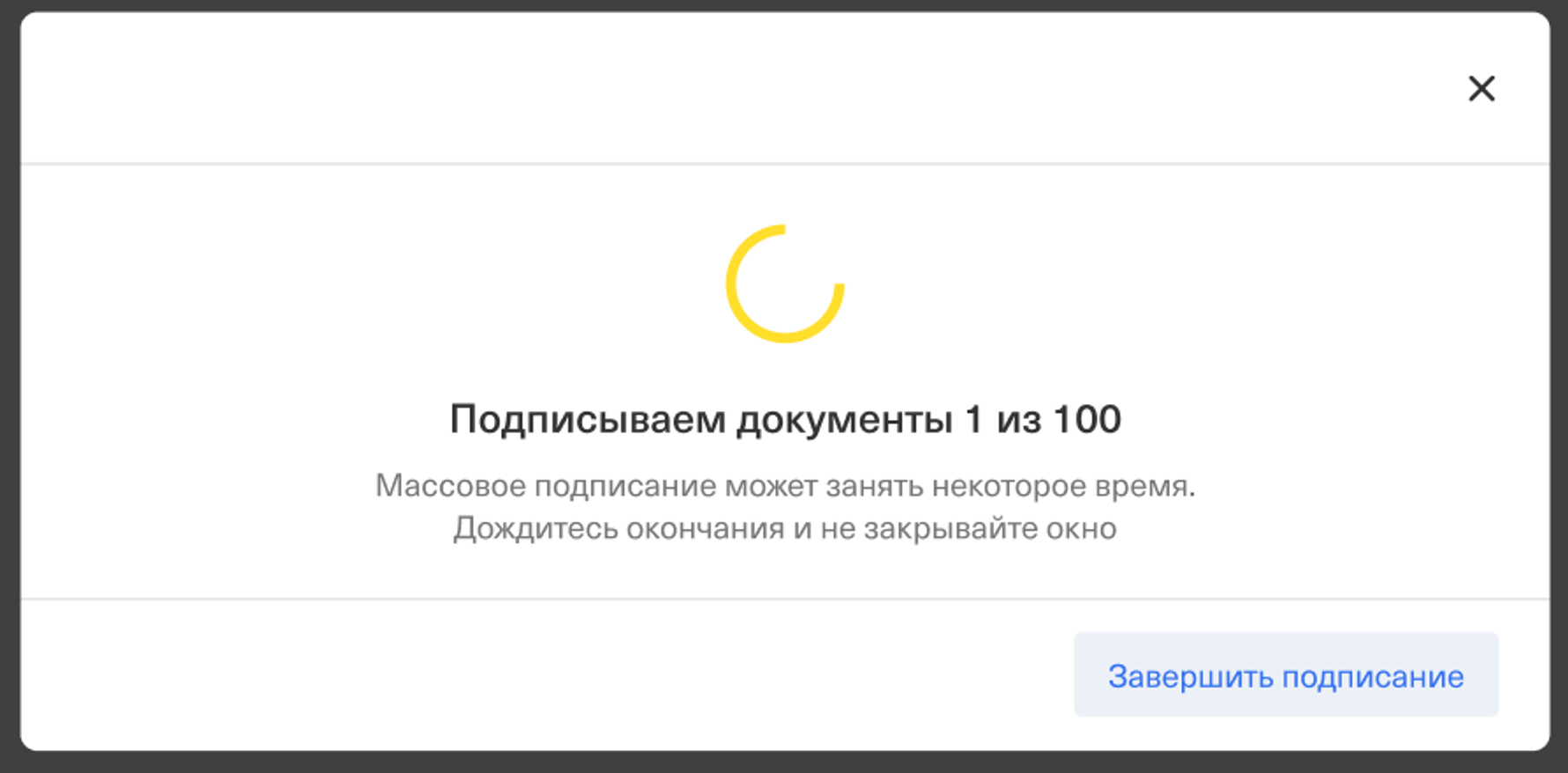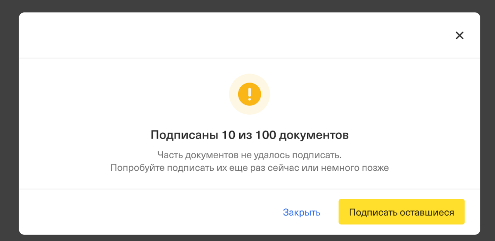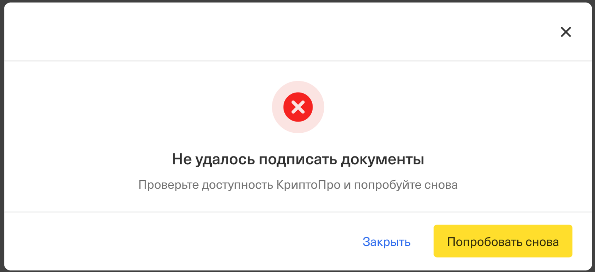 Это же окно отображается, если процесс подписания был прерван по техническим причинам (например, пропал интернет).