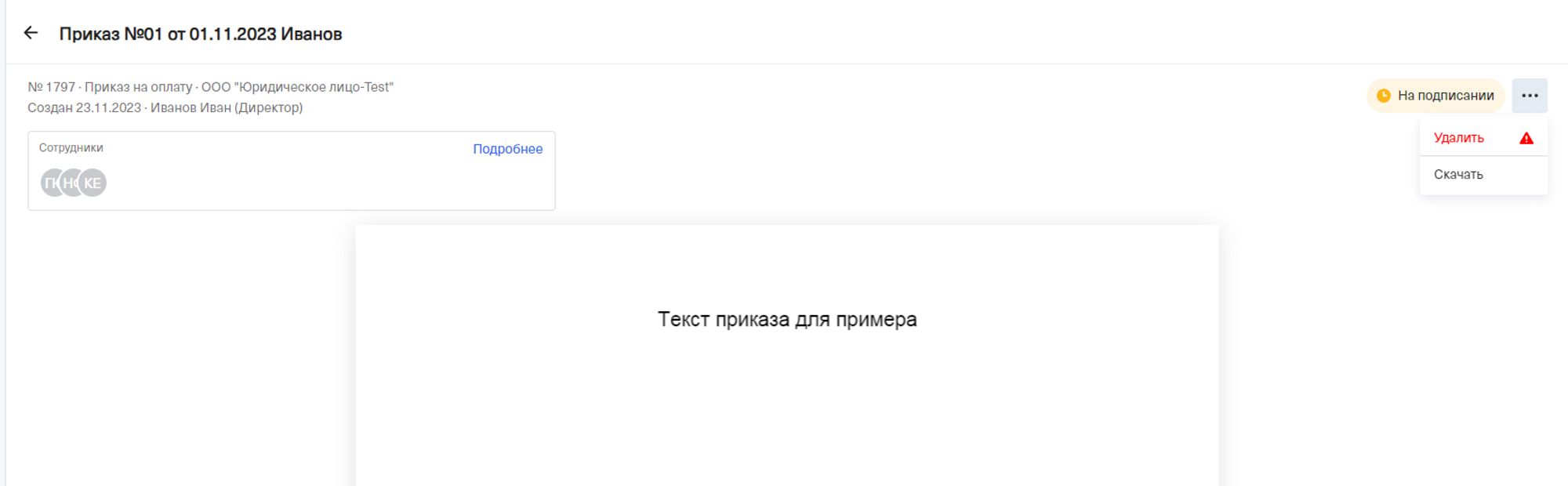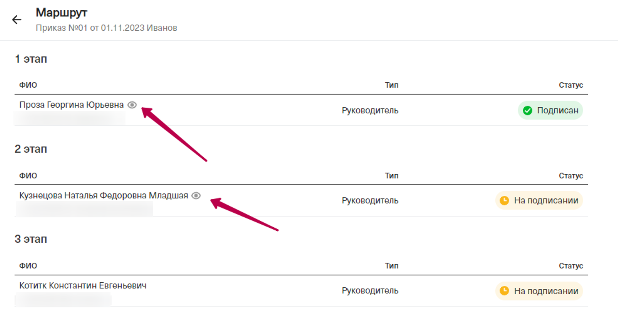 Чтобы понять, что сотрудник ознакомился с документом, но еще не подписал, то в личном кабинете компании отображается “глаз”.