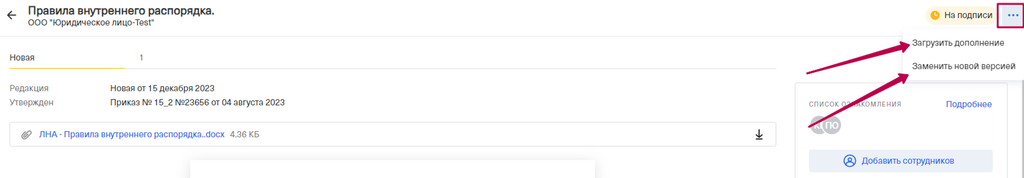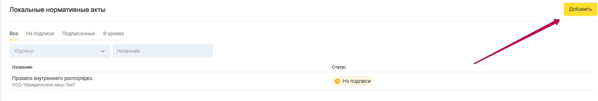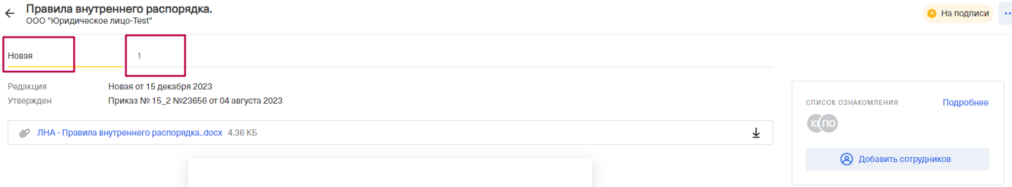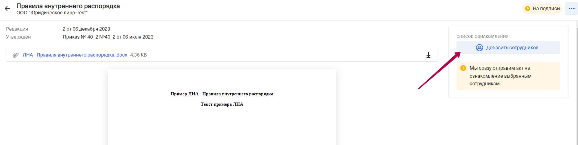 Если список подписантов нужно дополнить в уже существующей ЛНА, то перейдите в нужный документ и повторите процедуру добавления сотрудника.
