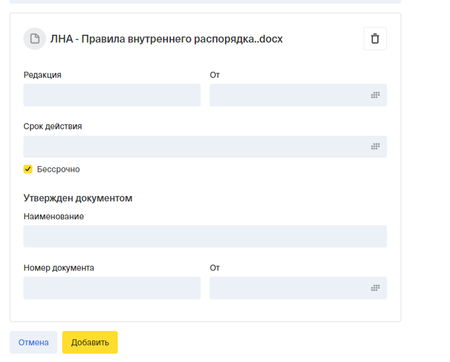 - Номер документа — Номер документа которым утвержден ЛНА.