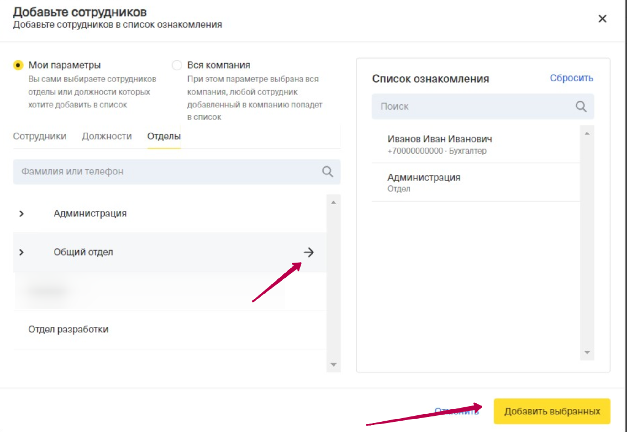 ⛔ Обращаем ваше внимание, что добавлять вы можете сотрудников поименно, по отделам или по должностям. Вы можете отправить ЛНА всей компании, выбрав “Вся компания”