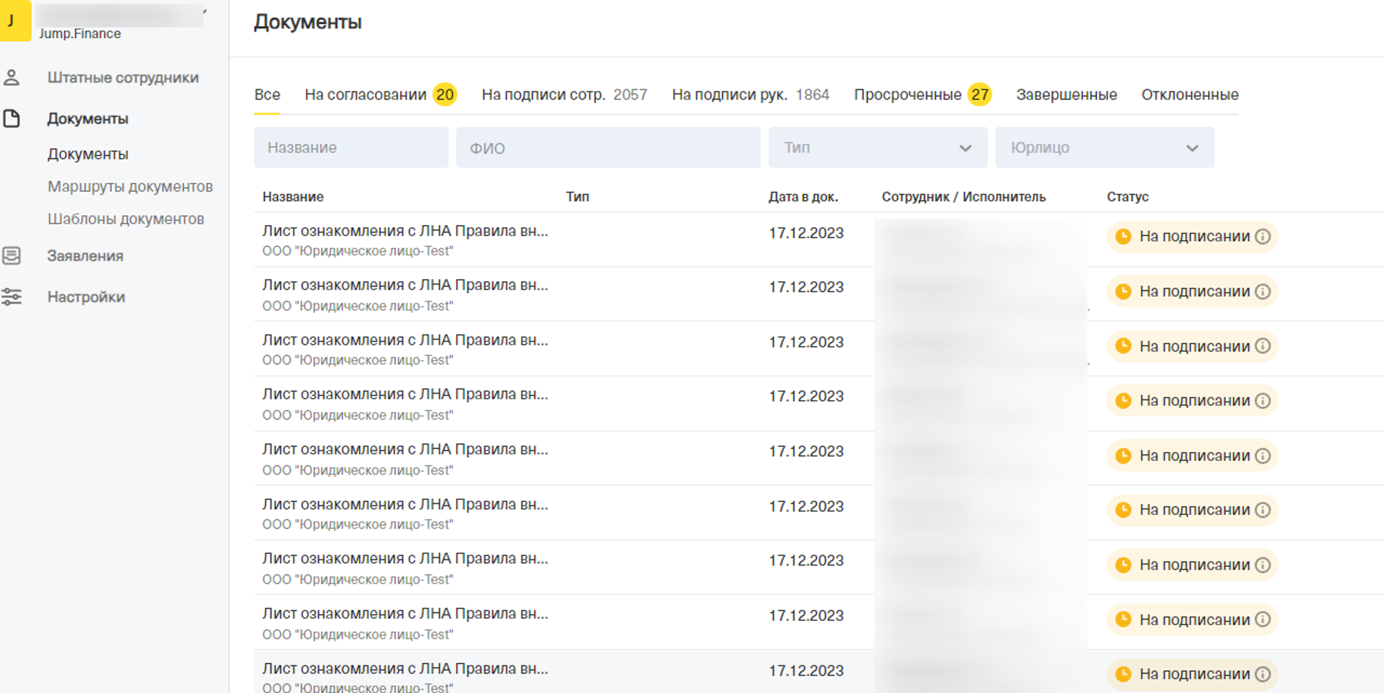 Когда список сформируется, документы уйдут на подпись сотрудникам и вы увидите их статус во вкладке «Документы».
