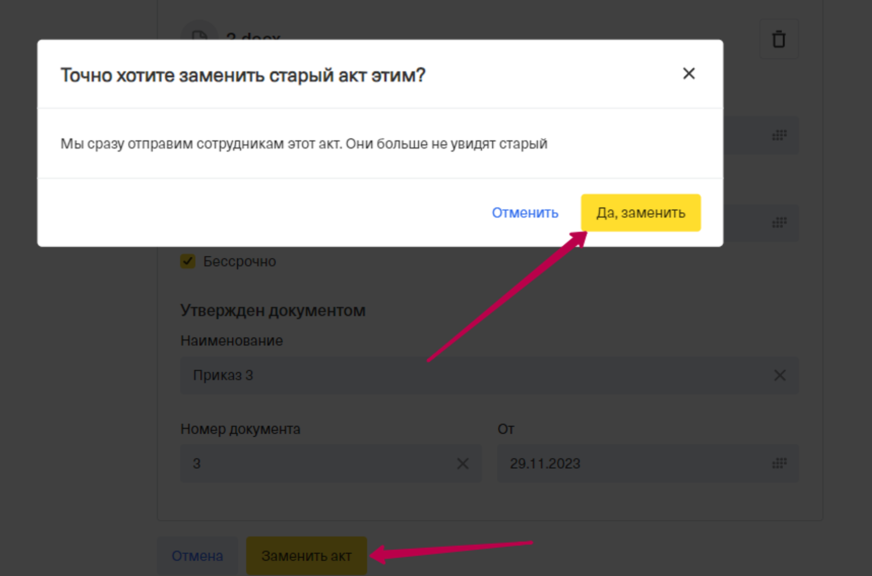 - Заменить новой версией — Когда вы заменяете ЛНА система предупреждает вас, что документ будет заменен и сотрудники не увидят старый документ (предыдущую версию ЛНА, которую они подписывали).