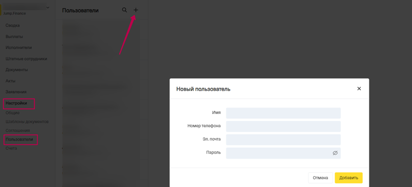 Для того чтобы добавить пользователя, необходимо перейти во вкладку “Настройки-Пользователи, нажав на черный плюс.
