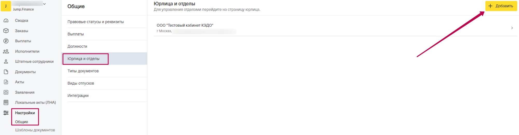 Для того чтобы добавить ЮЛ, необходимо нажать на кнопку “Добавить” во вкладке “Юрлица и отделы”.