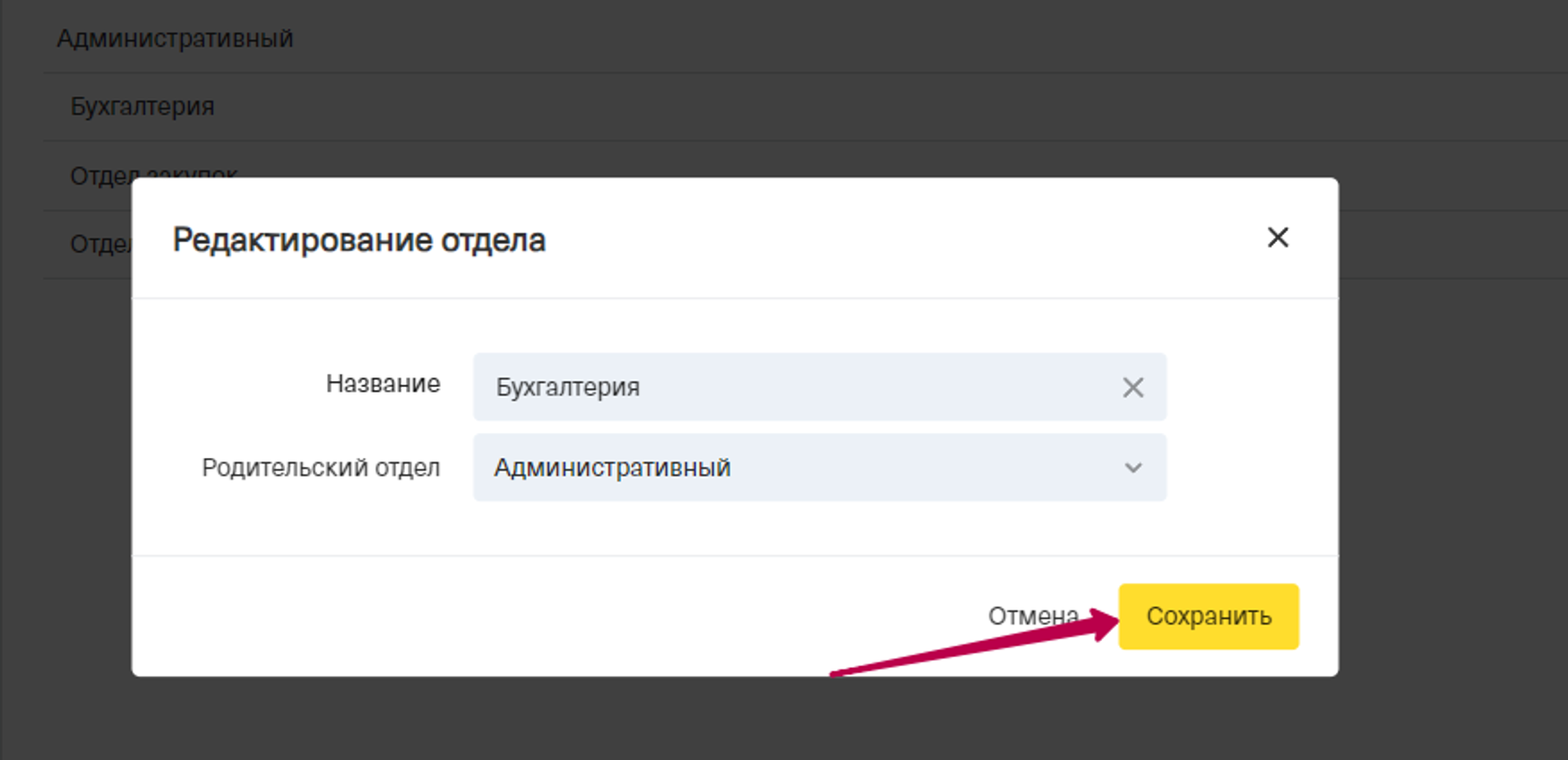 Для того чтобы удалить отдел, необходимо убедиться, что в нем не осталось штатных сотрудников, после этого выбрать необходимый отдел, нажать на три точки и выбрать “Удалить”