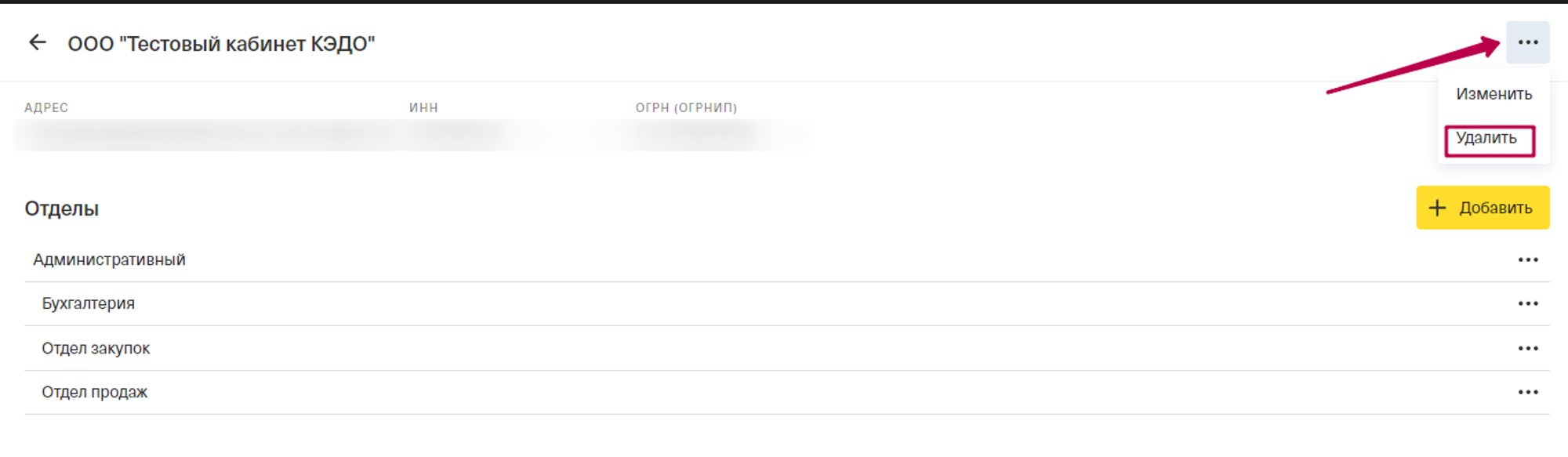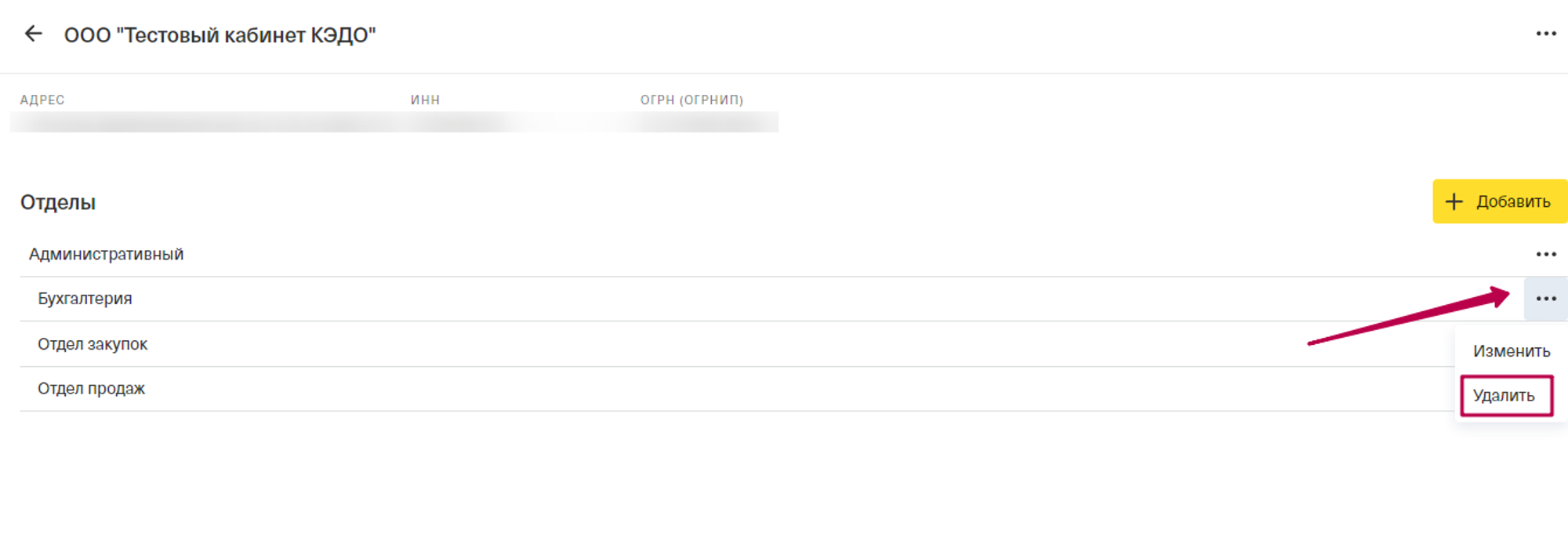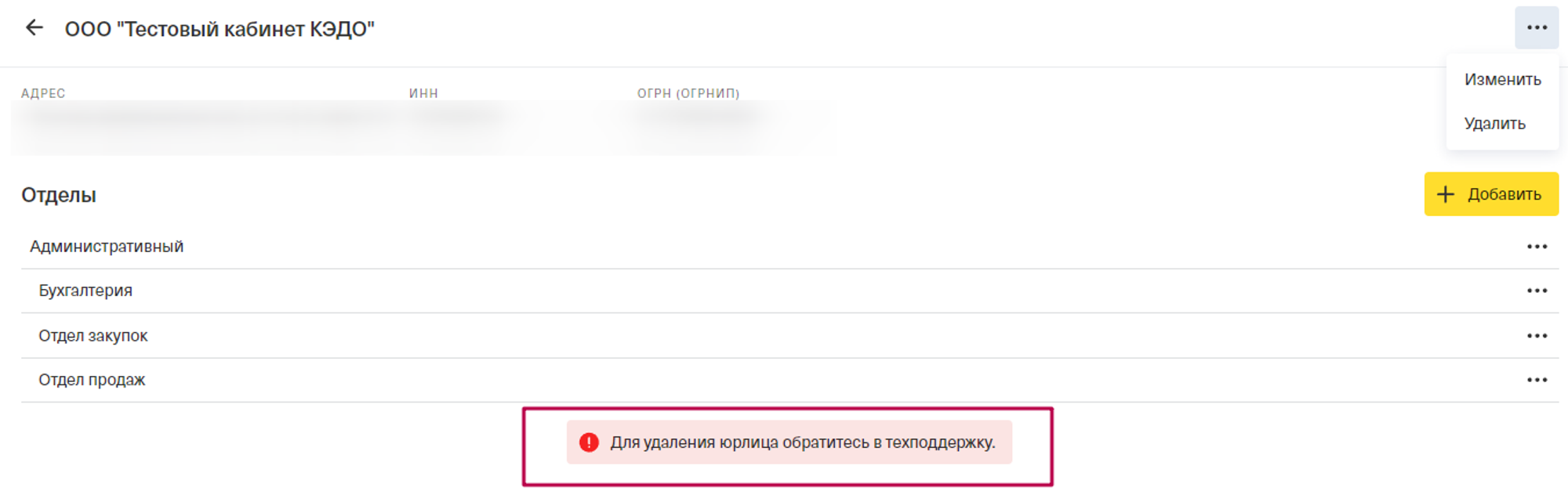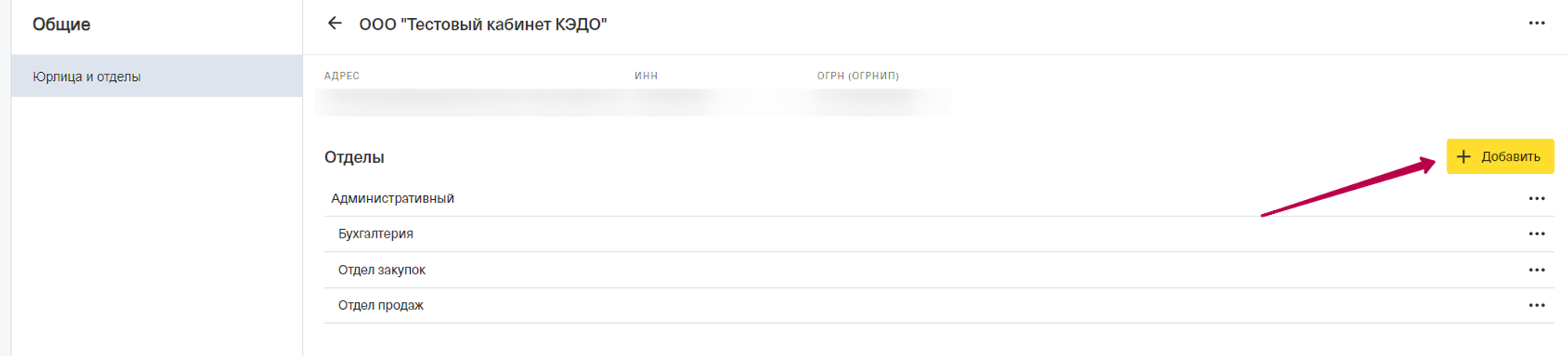 Перейдя в ЮЛ, можно добавить новые отделы в кабинет. Для этого нажмите на желтую кнопку “Добавить”