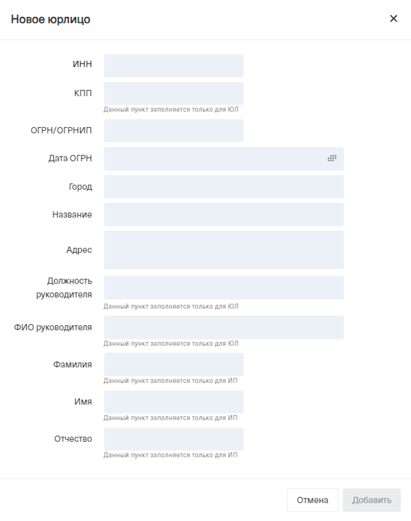 После этого заполнить открывшейся окно информацией о ЮЛ и нажимаете “Добавить”.