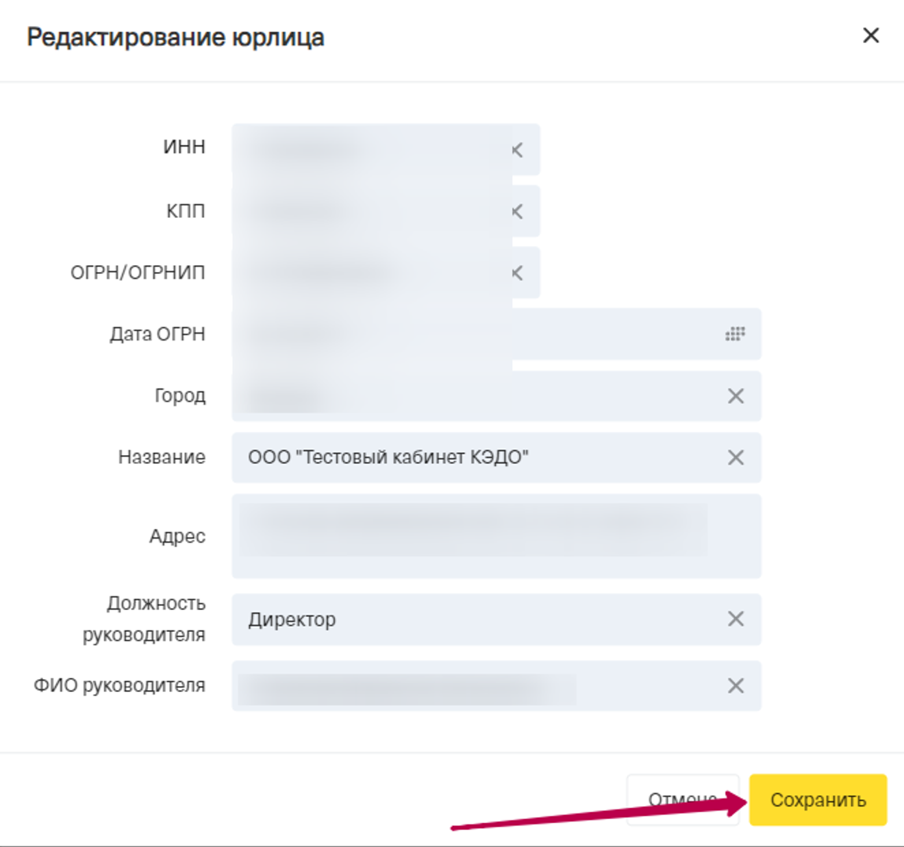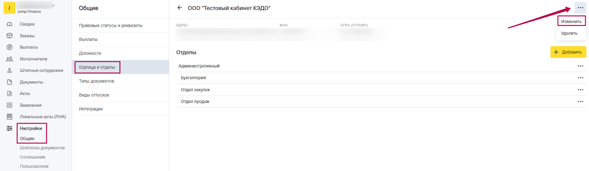Для того чтобы отредактировать данные о ЮЛ, необходимо перейти во вкладку “Настройки-Общие-Юрлица и отделы”, провалиться в ЮЛ, и нажать на три точки с правой стороны экрана, выбрать “Изменить”.