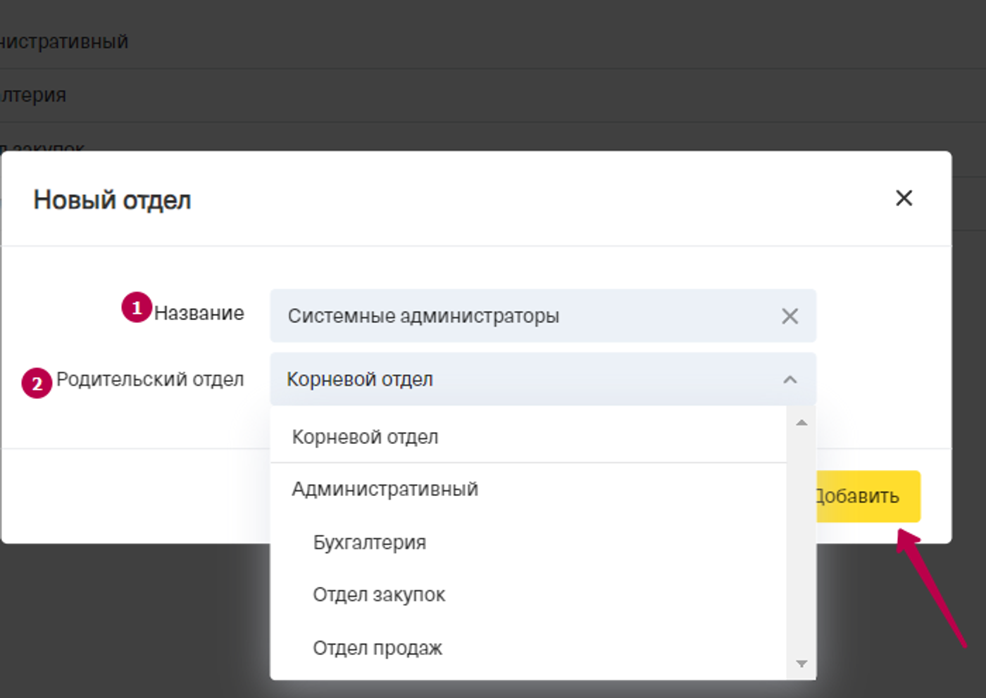 Заполните название, выберете корневой отдел и далее “Добавить”