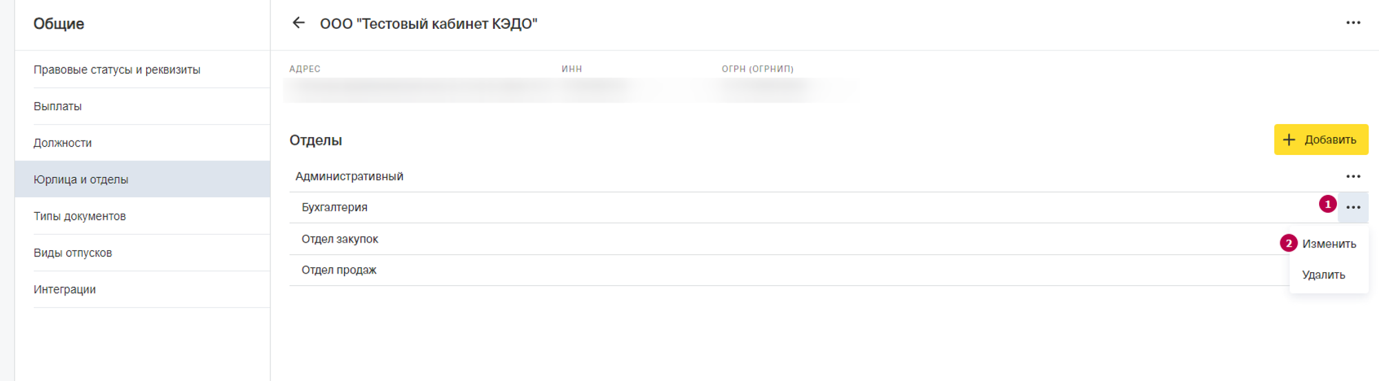 Для того чтобы отредактировать отдел, необходимо открыть ЮЛ, выбрать необходимый отдел, нажать на три точки, и выбрать “Изменить”.