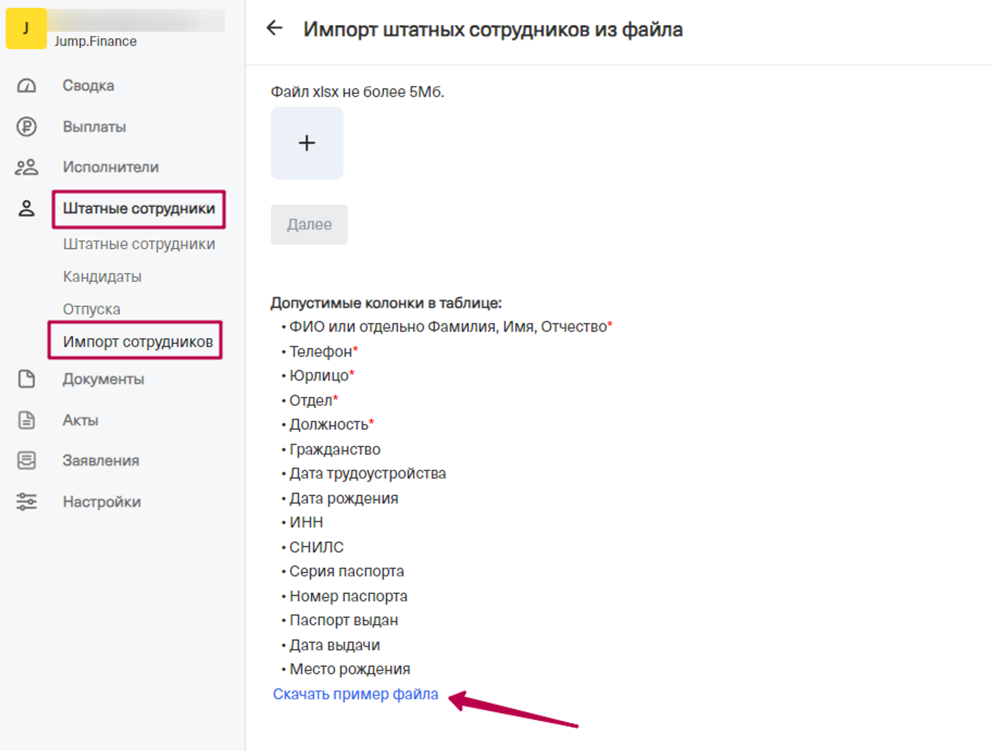 После того как заполните файл, вернитесь на страницу “Штатные сотрудники/Импорт сотрудников/+”, добавьте его в загрузку, нажав на кнопку “Далее”.