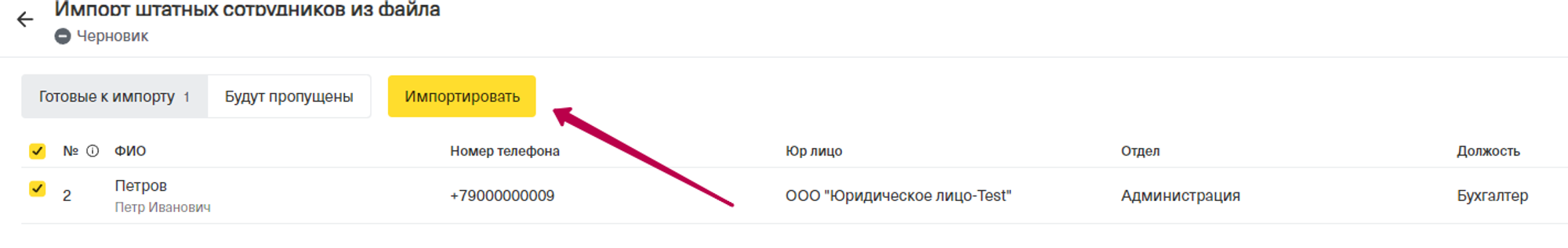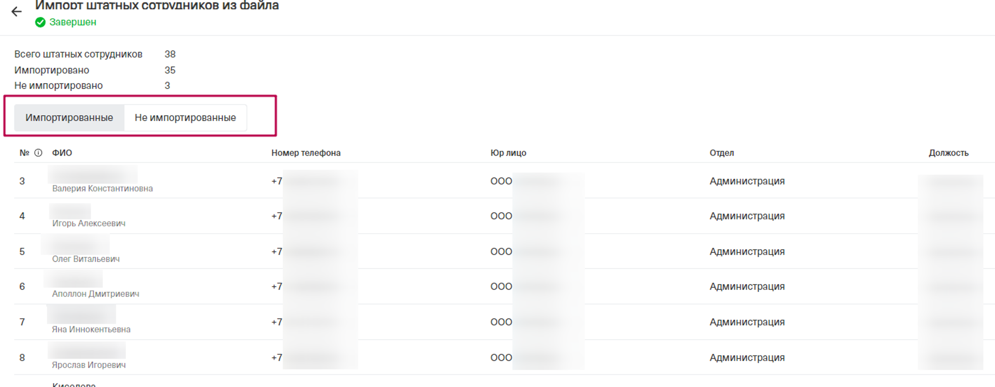 Как только импорт будет завершен, откроется окно в котором будет вкладка “Импортированные”. В ней отображены сотрудники, прошедшие импорт.