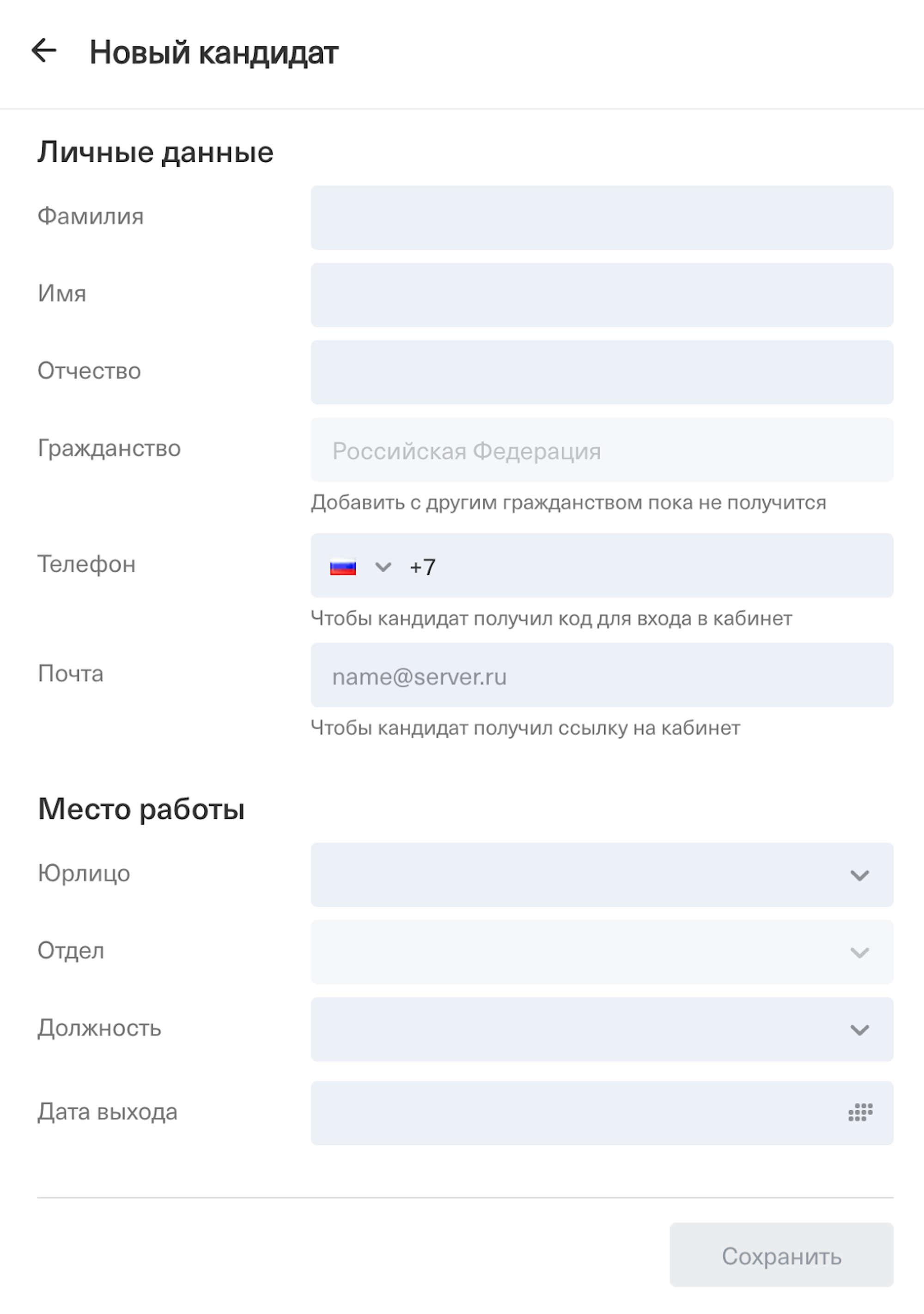 В открывшемся окне заполните ФИО, электронный адрес, телефон и должность на которую кандидат будет трудоустроен.