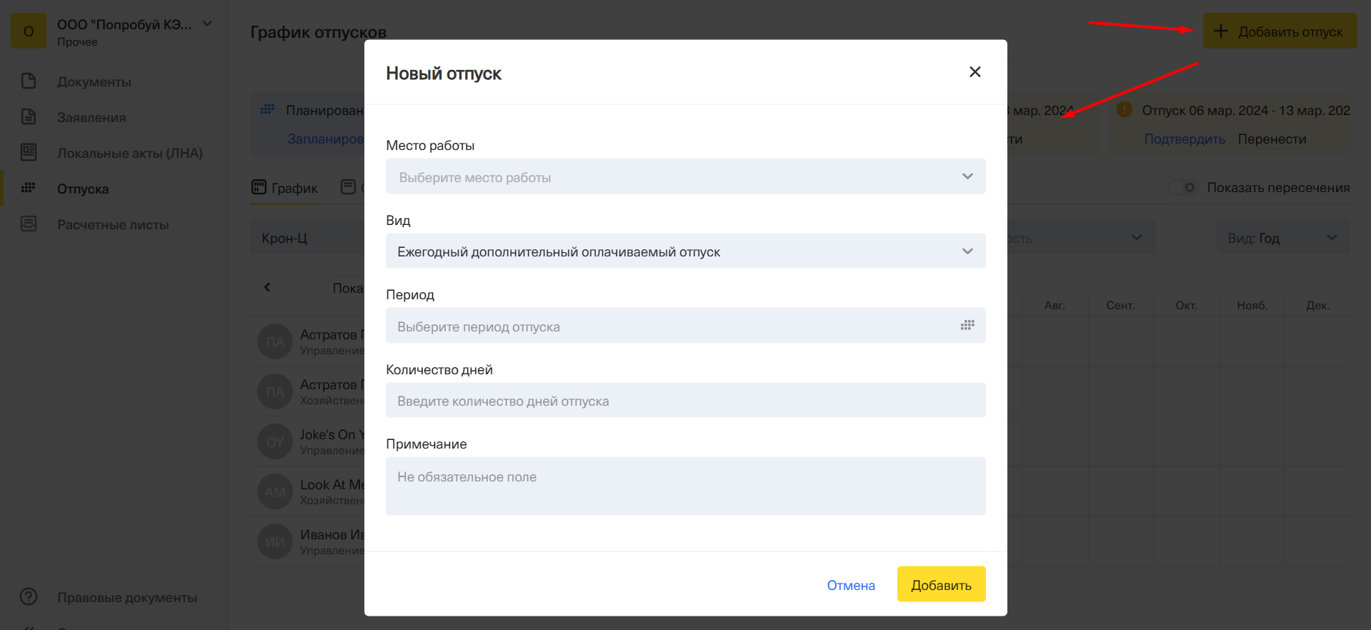 Кадровый специалист добавляет отпуск сотрудника вручную, нажав на кнопку “Добавить отпуск”, и заполняет текущие поля.