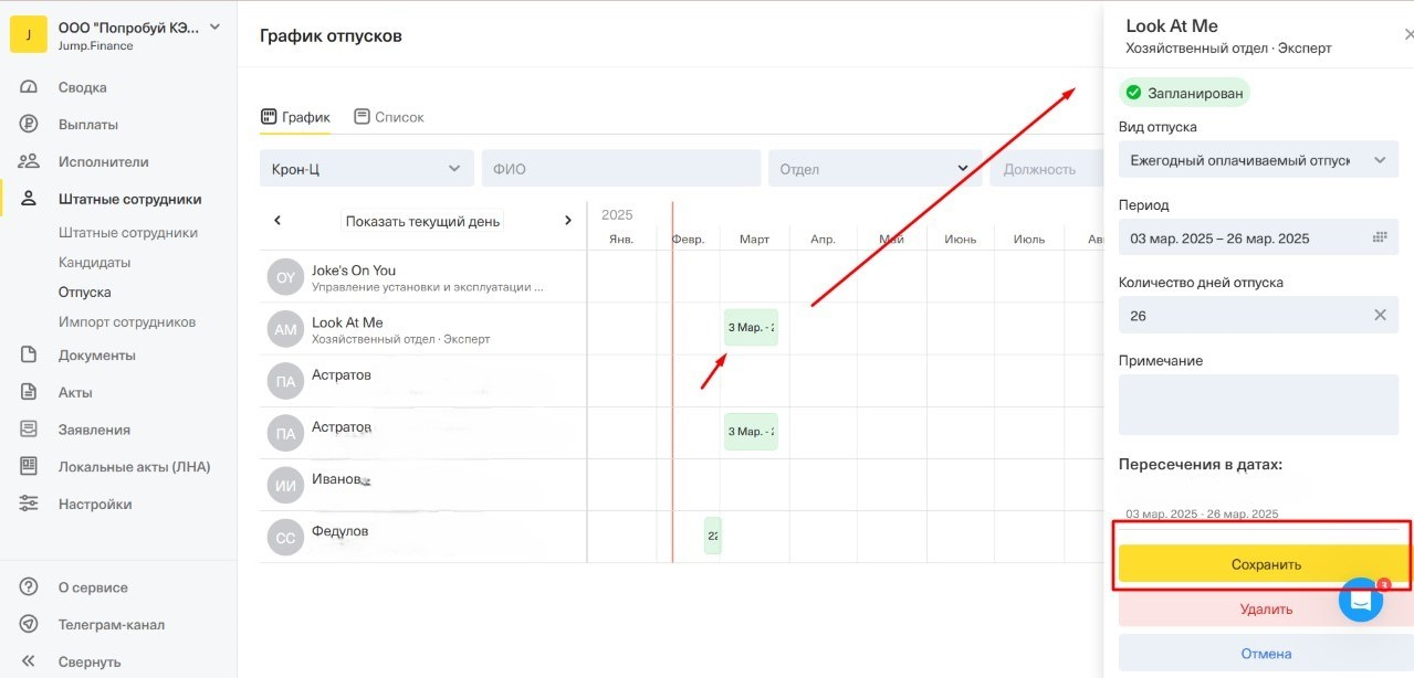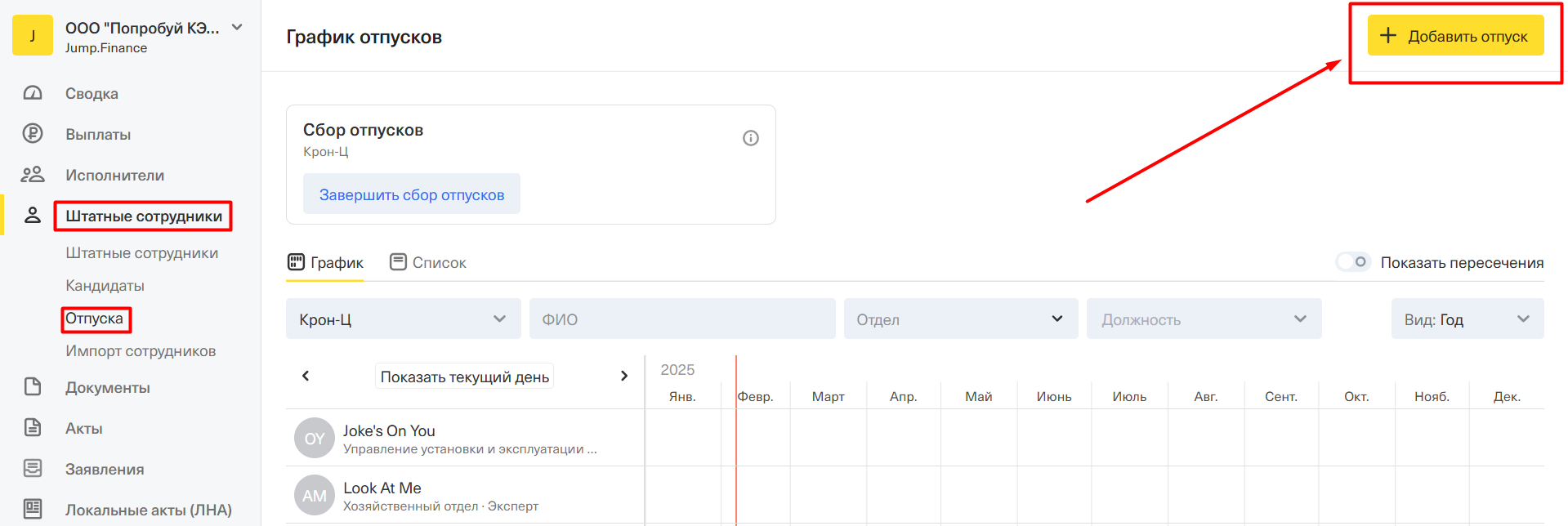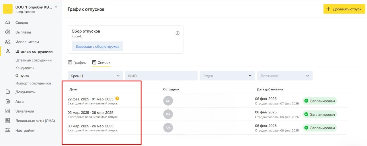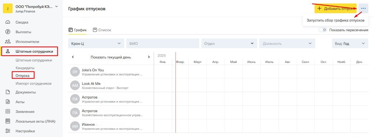 Во вкладке “Штатные сотрудники-Отпуска” вы можете начать сбор графиков отпусков сотрудников.