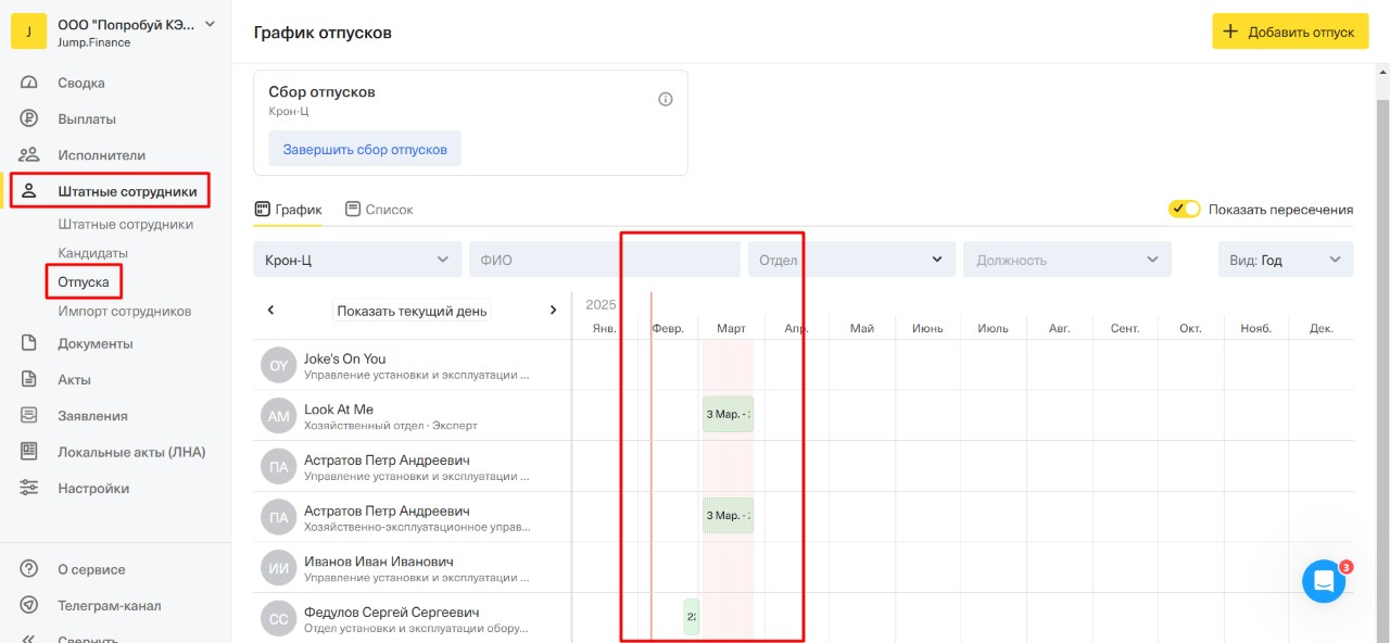 Запланированные отпуска, через функционал “Сбор графика отпусков”, в графике будут отображаться серым цветом. Отпуска, после завершения сбора графиков отпусков, будут выделены зеленым цветом. Красным будут отражены пересечения отпусков сотрудников. Проверить пересекаются ли графики можно с помощью чек бокса “Пересечение”. Также можно использовать активные фильтры и по ЮЛ, ФИО сотрудника, отделам и должностям.