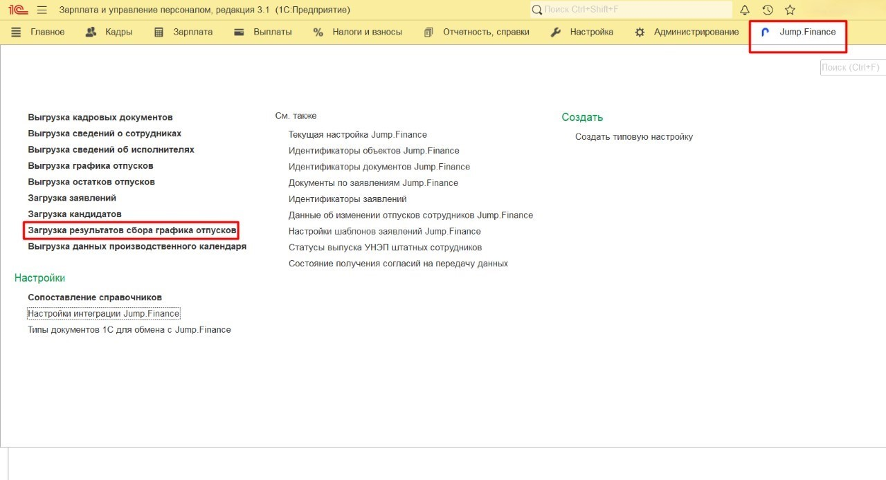 Для того чтобы выгрузить из ЛК в 1С результат сбора графиков отпусков, необходимо перейти в модуль, выбрать "Загрузка результатов сбора отпусков"
