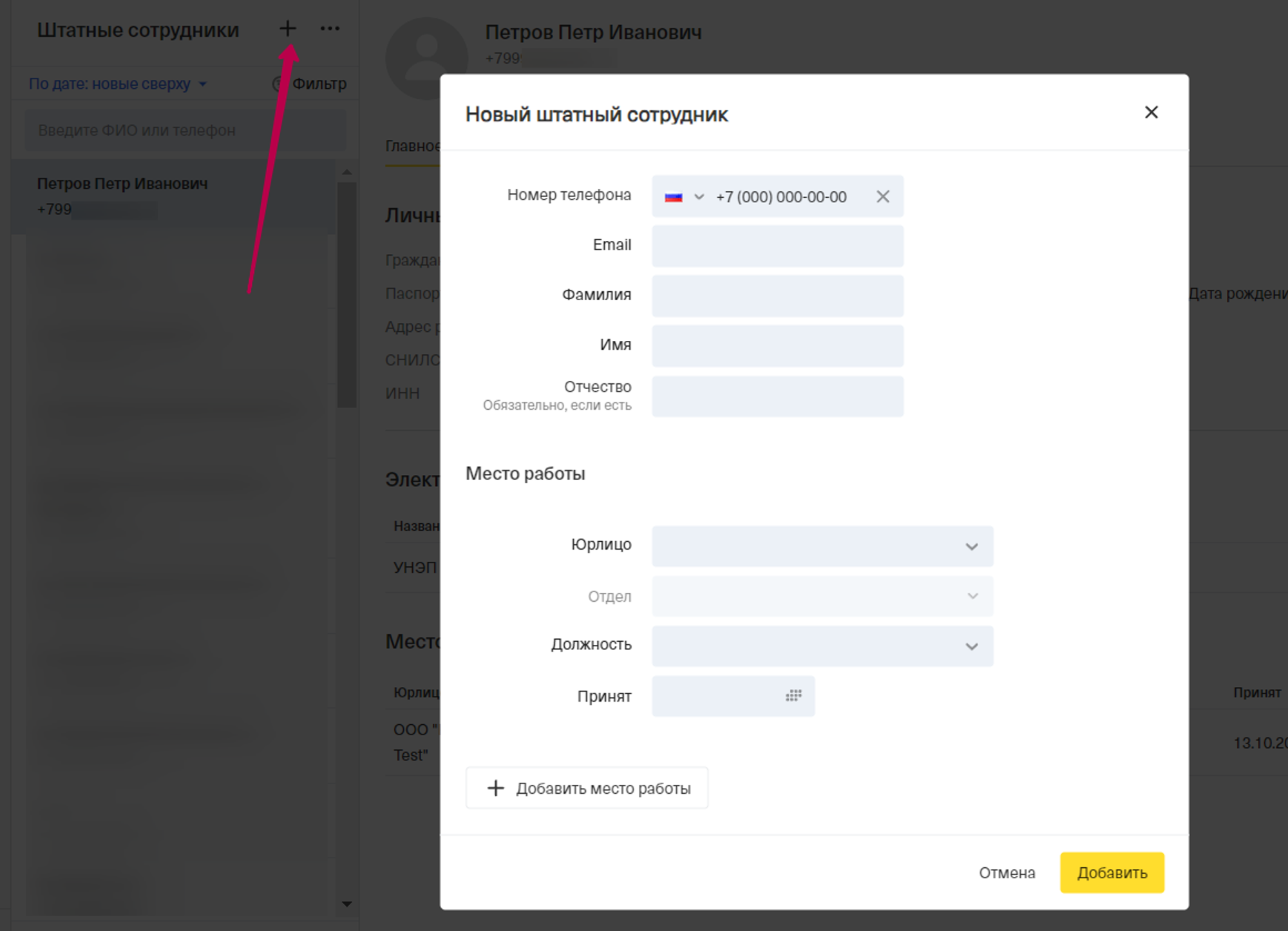 Нажимаете на черный плюс, и в открывшемся окне, указываете номер телефона в формате +79000000000, далее прописываете данные сотрудника и добавляете должность с указанием даты приема.